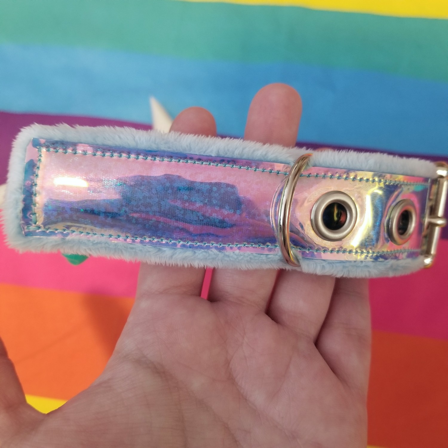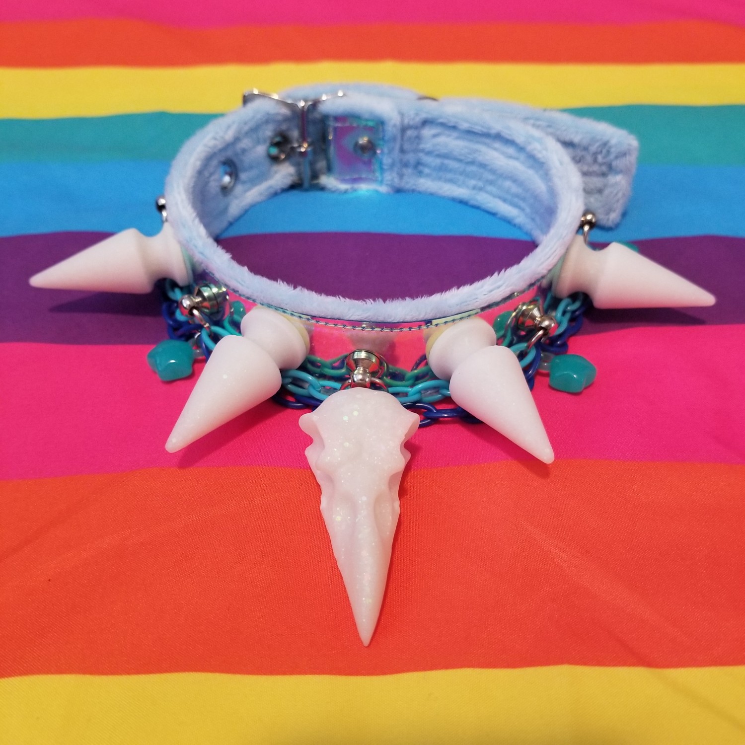 This collar is 1.25" wide and features holographic blue vinyl on pastel blue minky fabric, glittery matte white resin spikes and bird skull, and blue plastic chain. It is adjustable in length to 13", 14", 15", and 16".