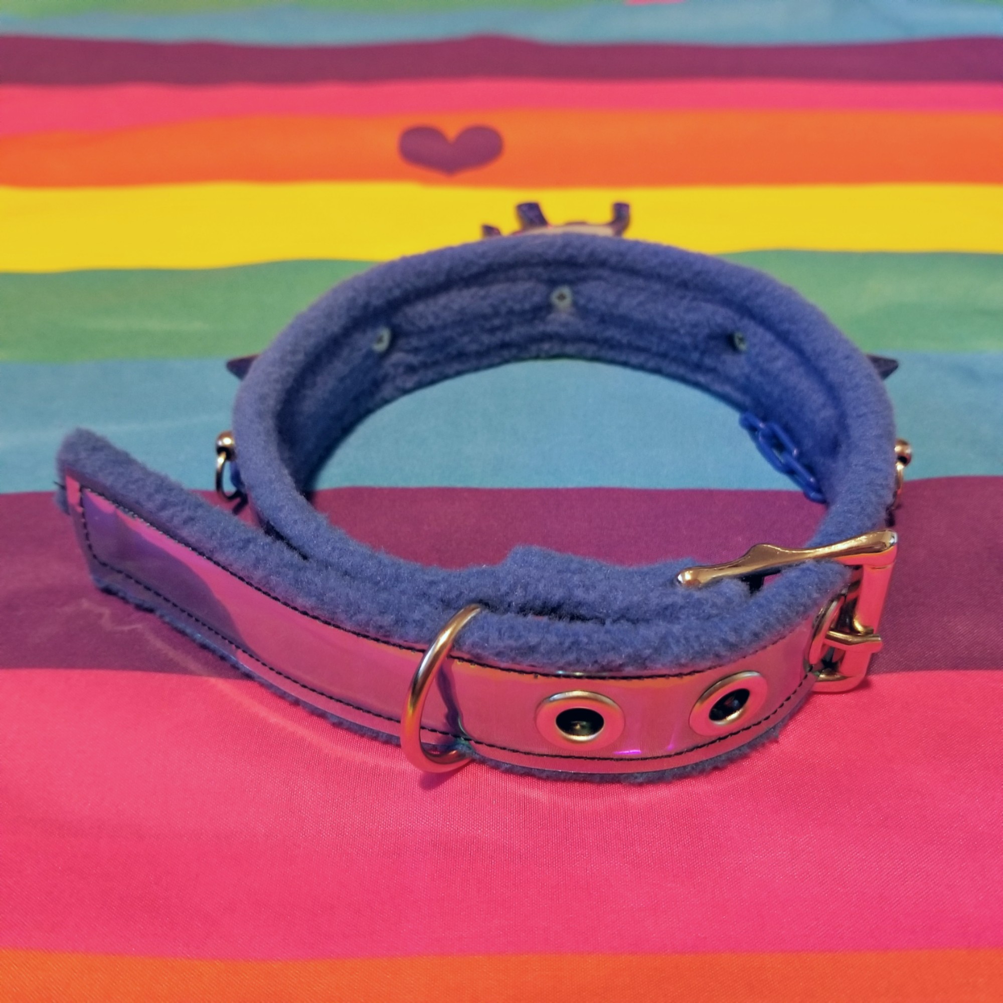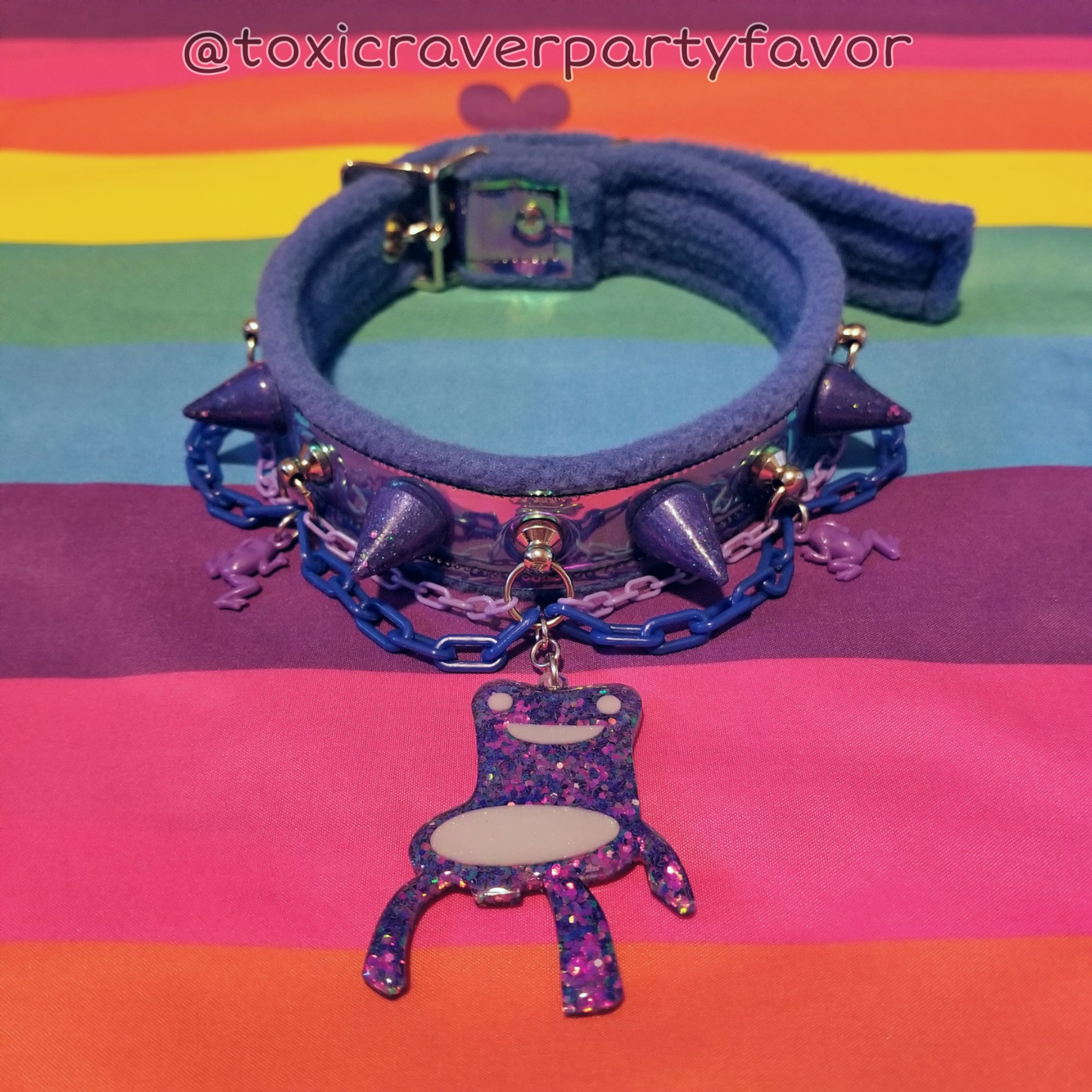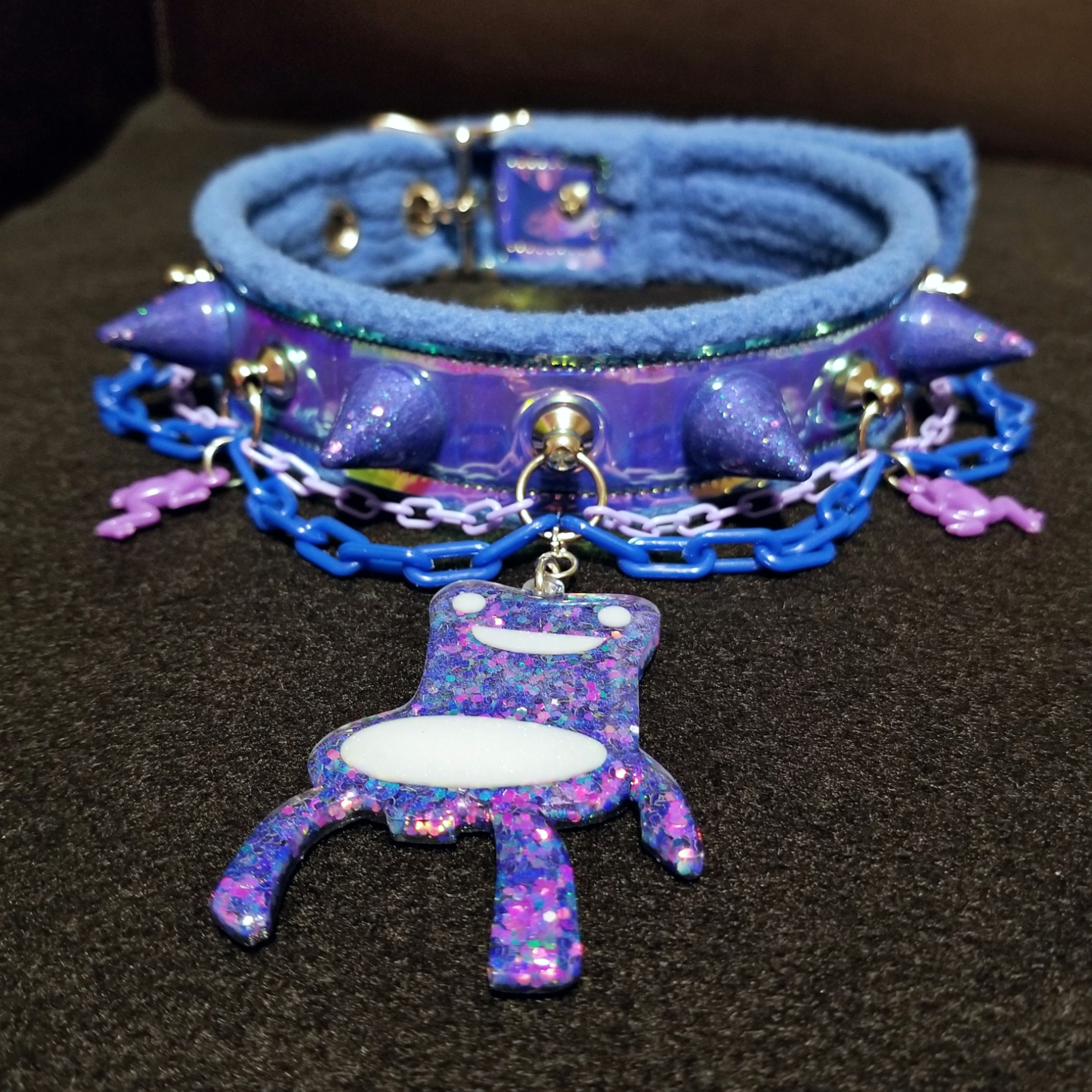 This collar is 1.25" wide and features a dark blue fleece base with holographic blue vinyl, glittery blue resin spikes, and a blue holographic froggy chair pendant. It is adjustable in length to 14", 15", and 16".