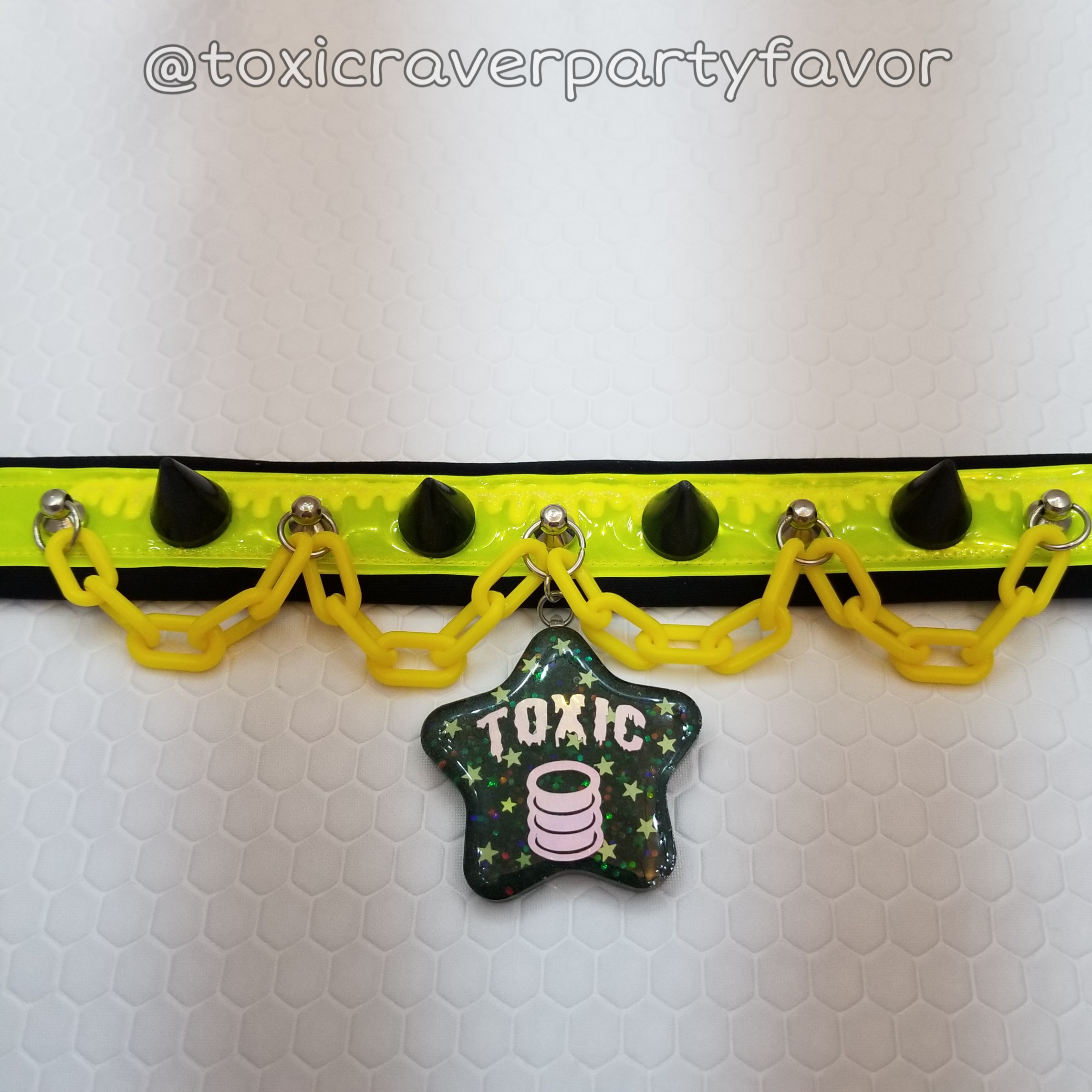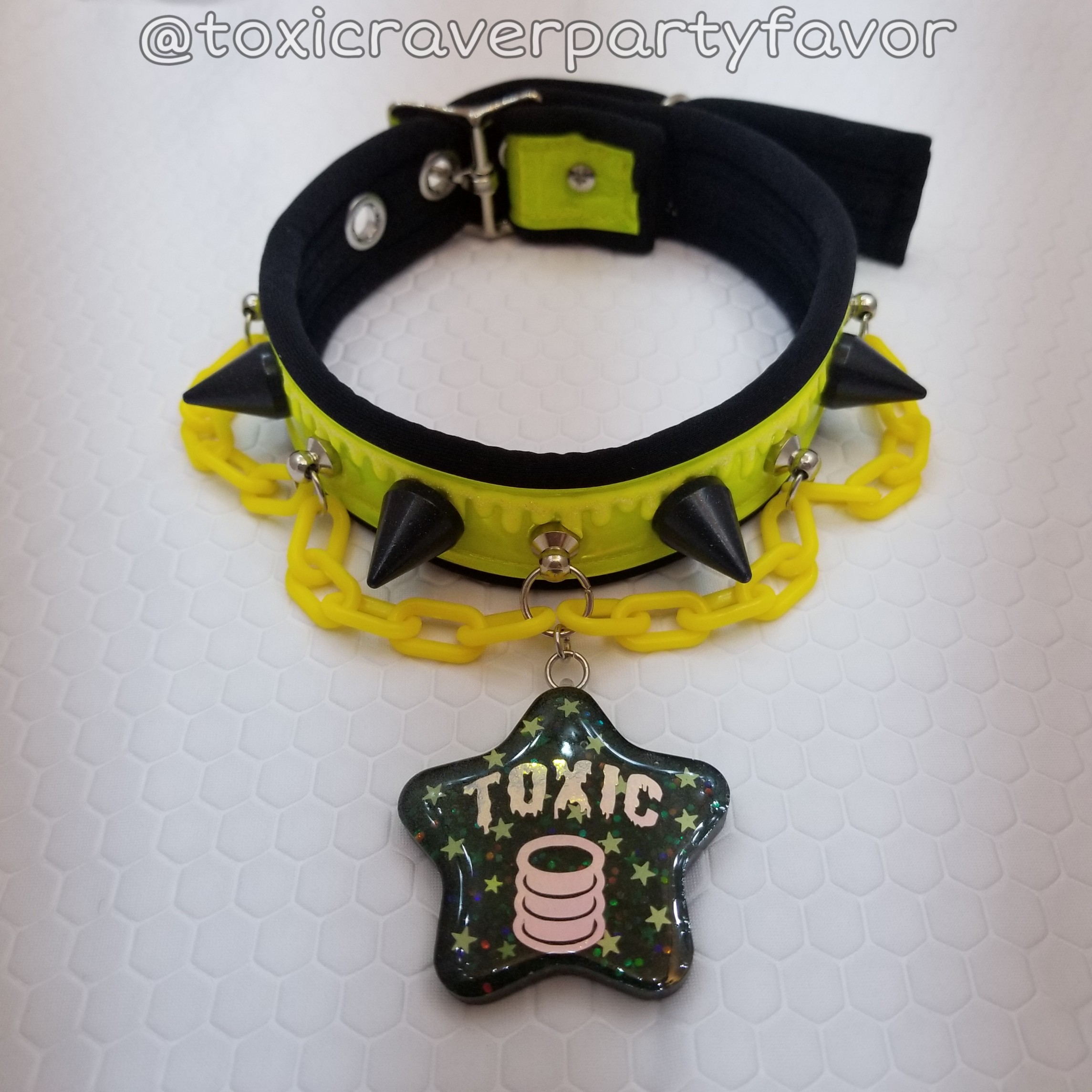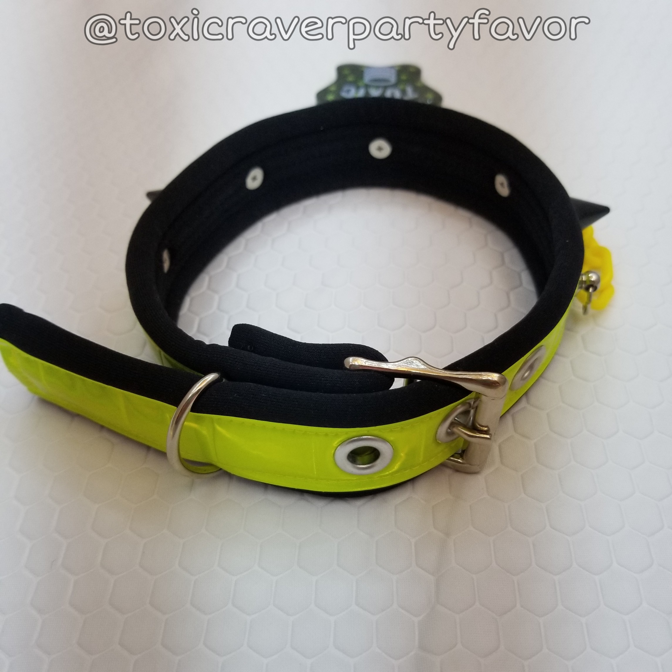 This collar is 1.25" wide and features a black base with yellow reflective vinyl, neon yellow glitter slime, black resin spikes, and yellow plastic chain. It is adjustable in length to 13", 14", 15", and 16"