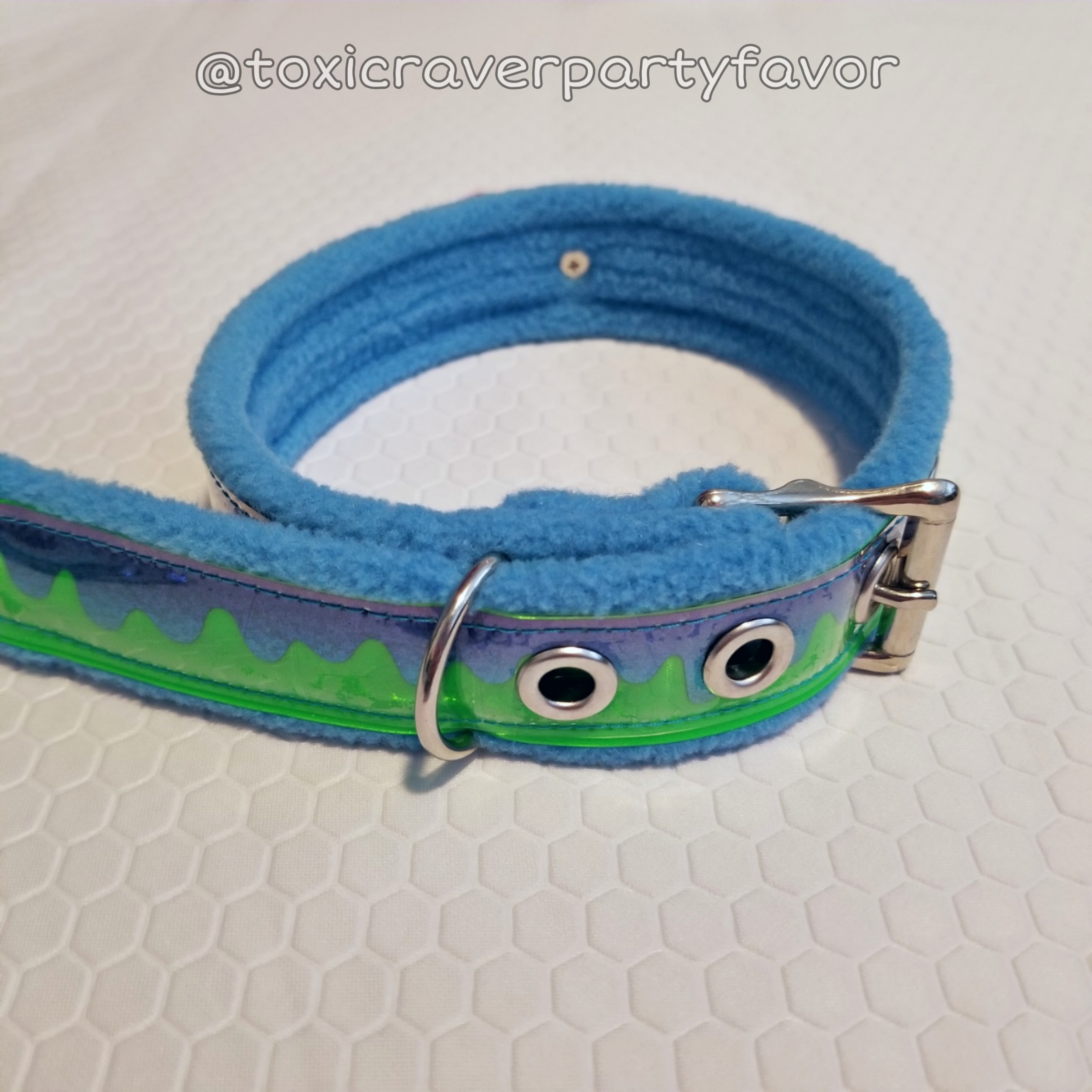 This collar is 1.25" wide and features a blue fleece base with reflective green vinyl, glittery blue slime decal, and a green/blue/purple starry spaced out pendant. It is adjustable in length to 13", 14", 15", and 16".