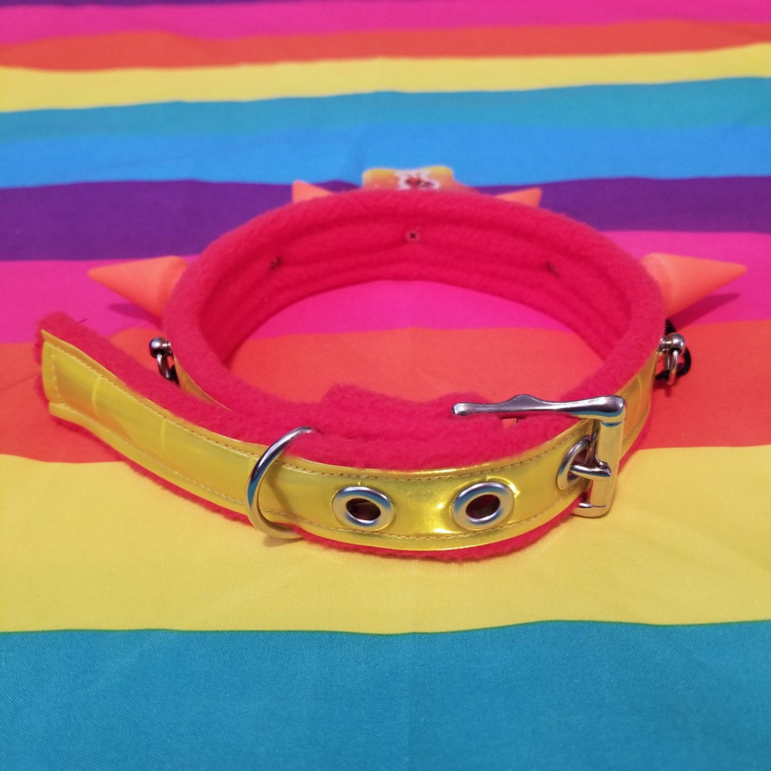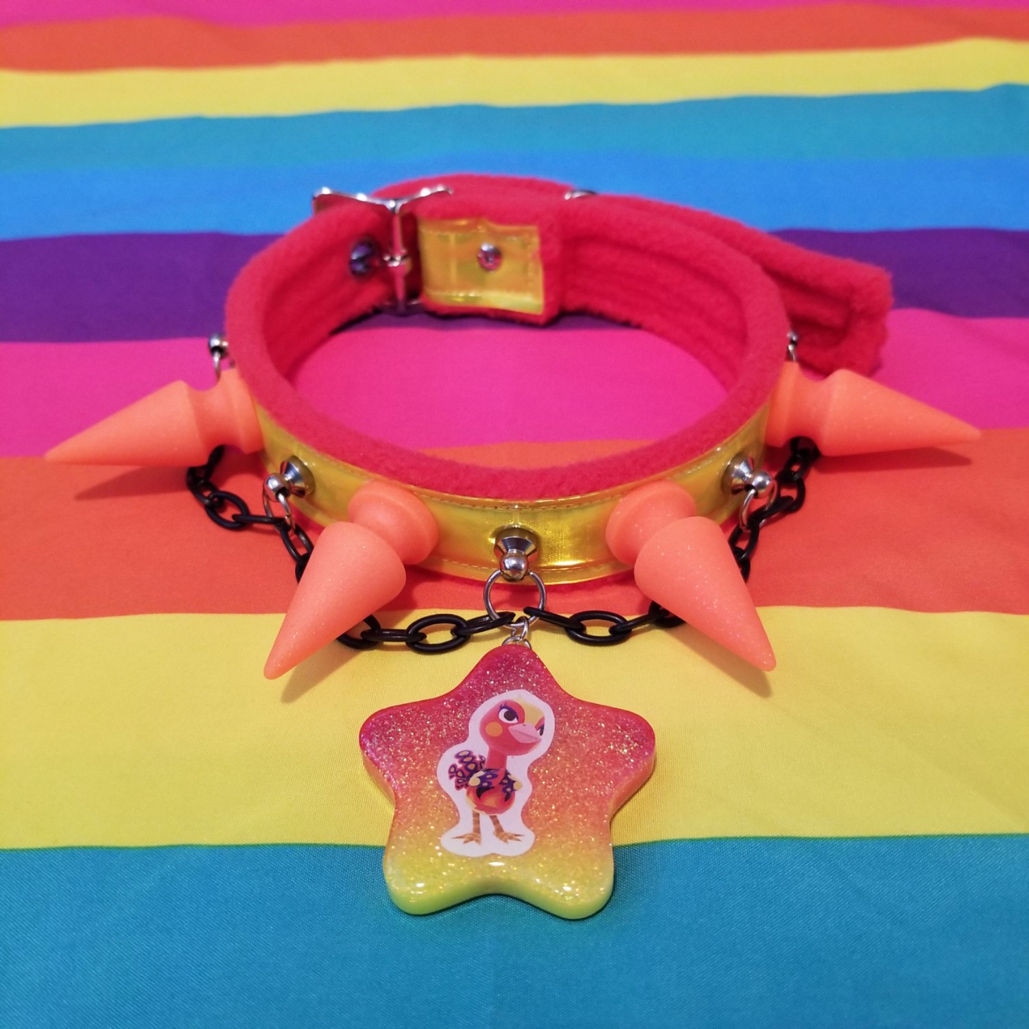 This collar is 1.25" wide and features yellow reflective vinyl on red fleece with neon orange matte resin spikes, a resin pendant with phoebe from animal crossing, and black chain. It is adjustable in length to 14", 15", and 16".