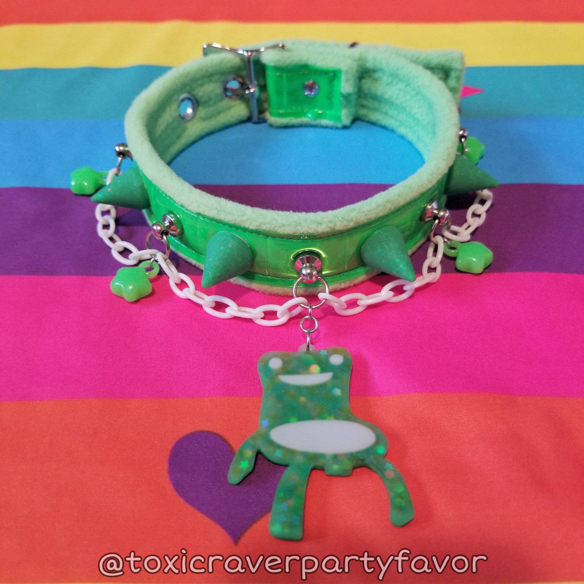 This collar is 1.25" wide and features a neon green fleece base with green reflective vinyl, a green holographic froggy chair pendant, and green holograpgic resin spikes. It is adjustable in length to 13", 14", and 15".