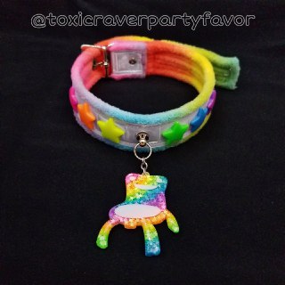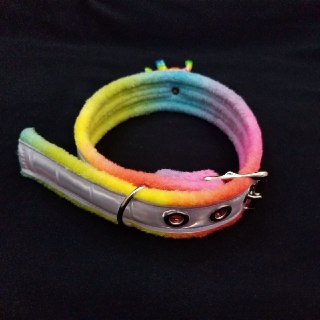 This collar is 1.25" wide and features a rainbow fleece base with white reflective vinyl, neon resin stars, and a rainbow starry froggy chair pendant. It is adjustable in length to 13", 14", and 15".