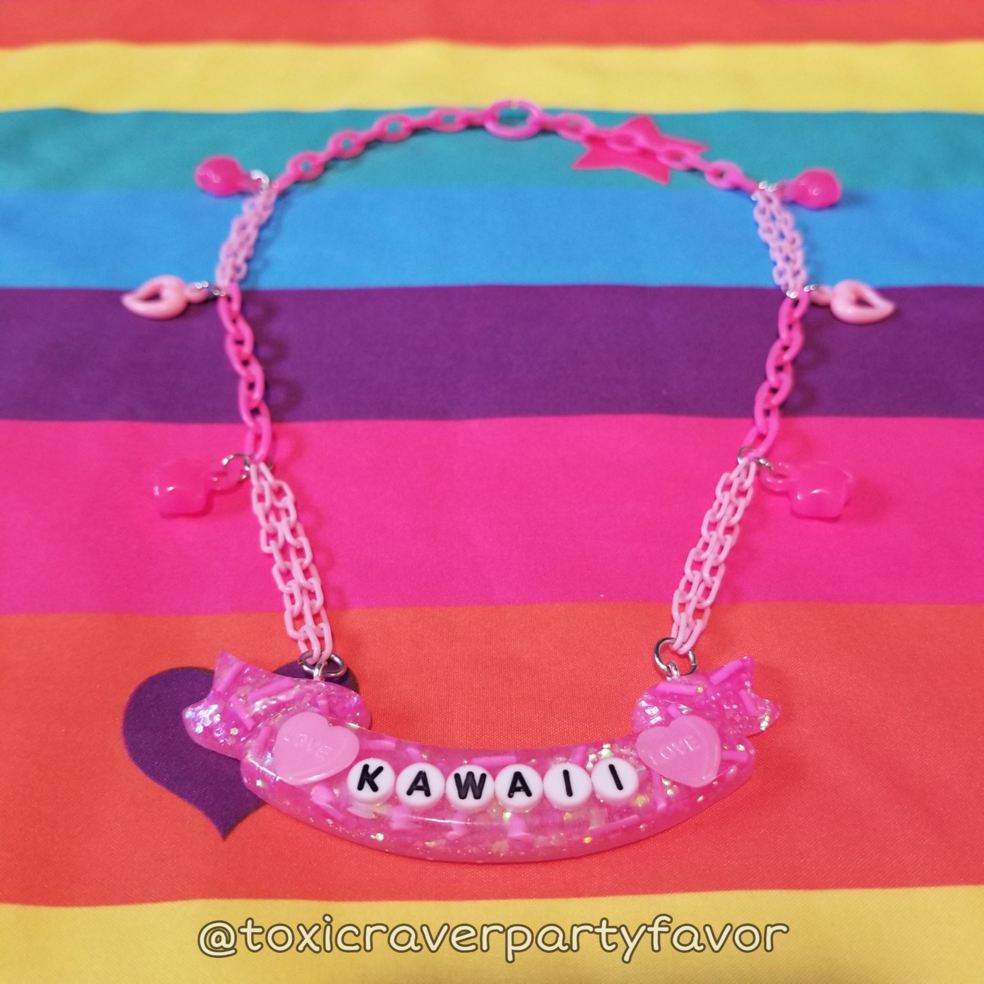 This necklace is 20" long and features a holographic pastel pink kawaii banner that's about 3.5" x 1" on pink plastic chain with heart and star charms
