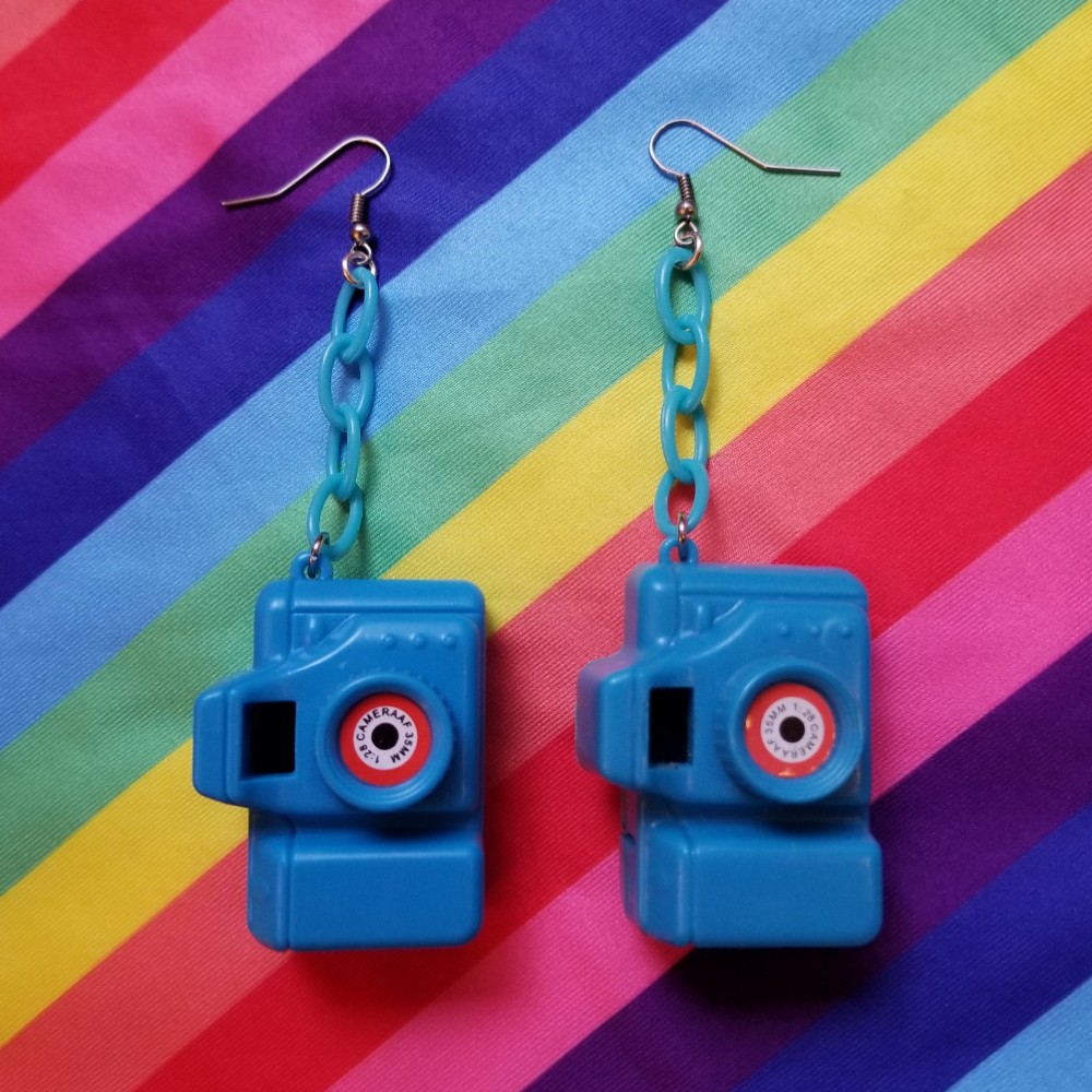 These earrings are stainless steel and feature blue toy cameras on blue plastic chain