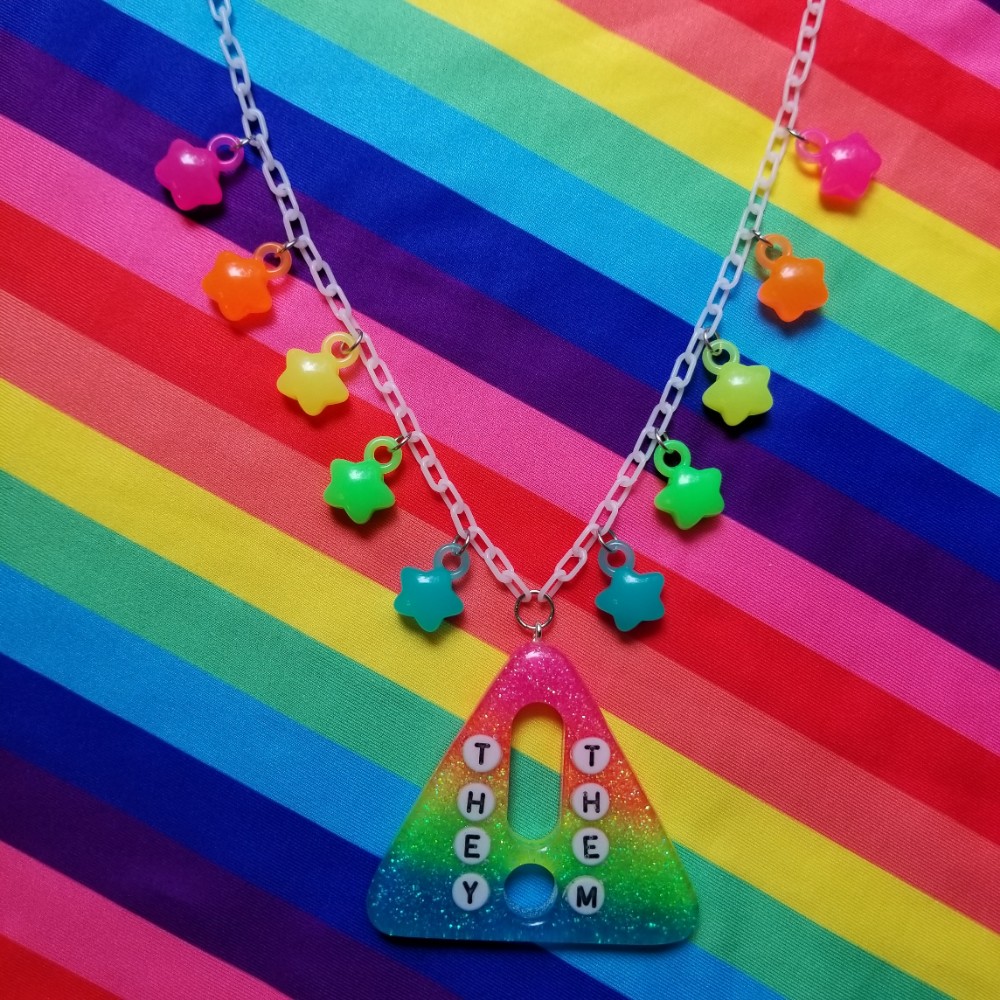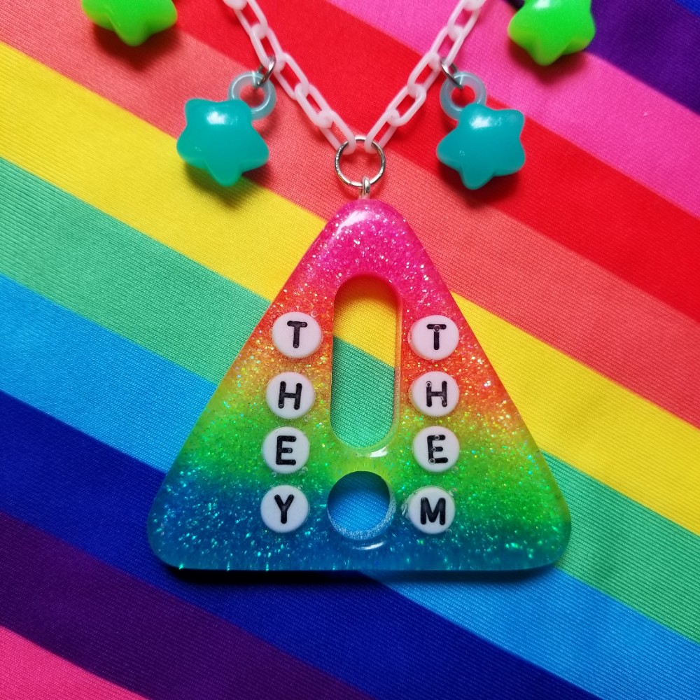 This necklace features a rainbow glittery hazard sign with they/them pronouns thats about 2.5" x 2.5" on a 20" white plastic chain with rainbow star charms