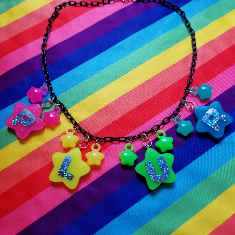 This necklace features neon star charms that are about 1" x 1" on an 18" black chain.