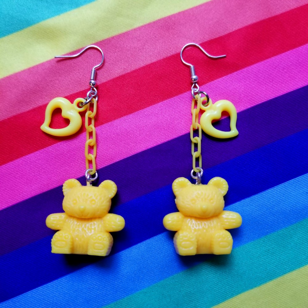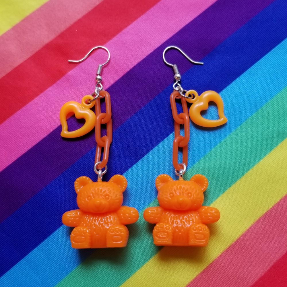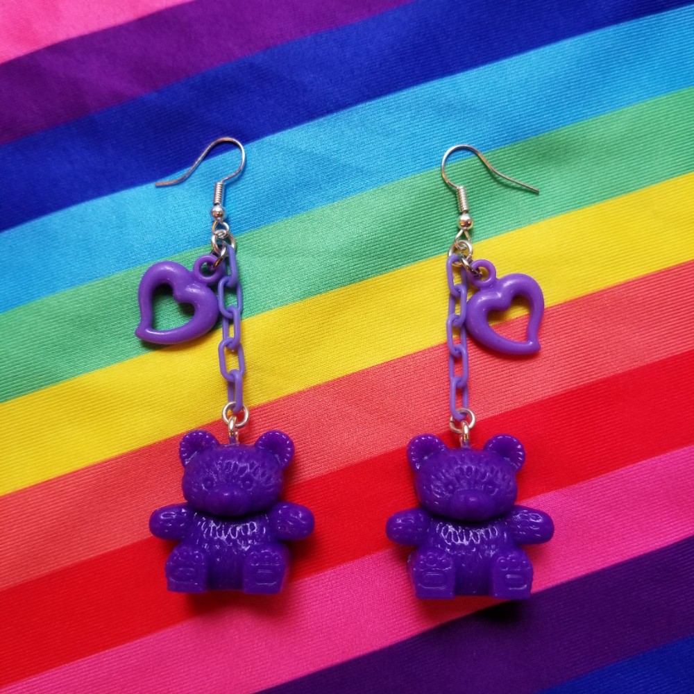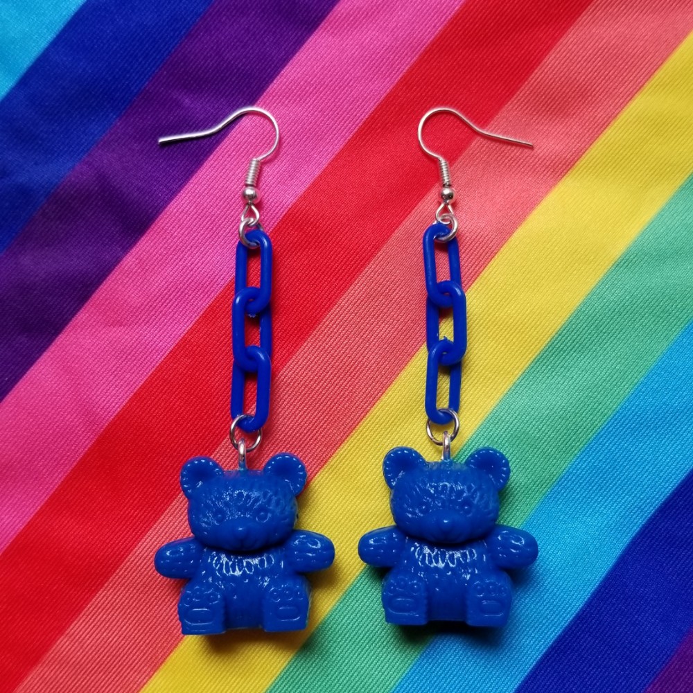 These earrings are made of stainless steel and are about 3" long including the bear and chain.