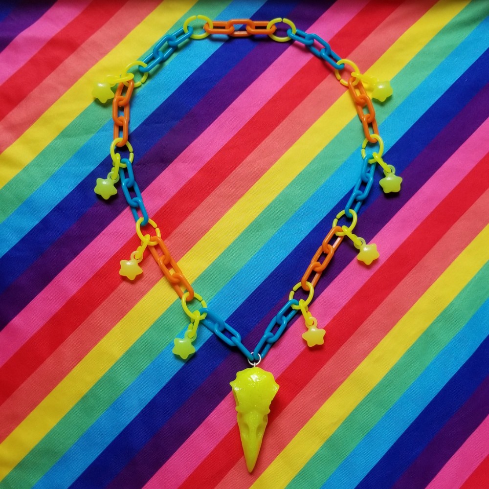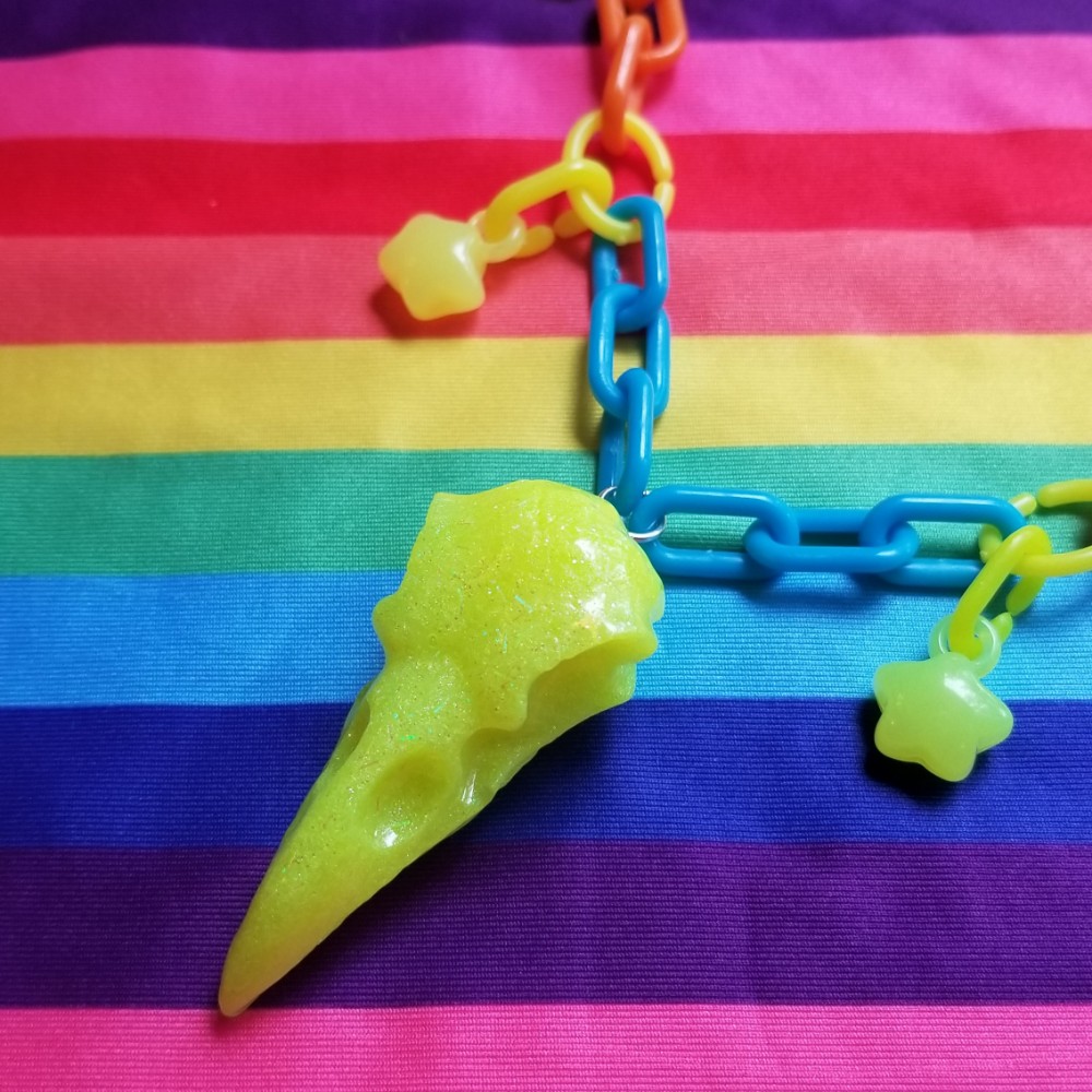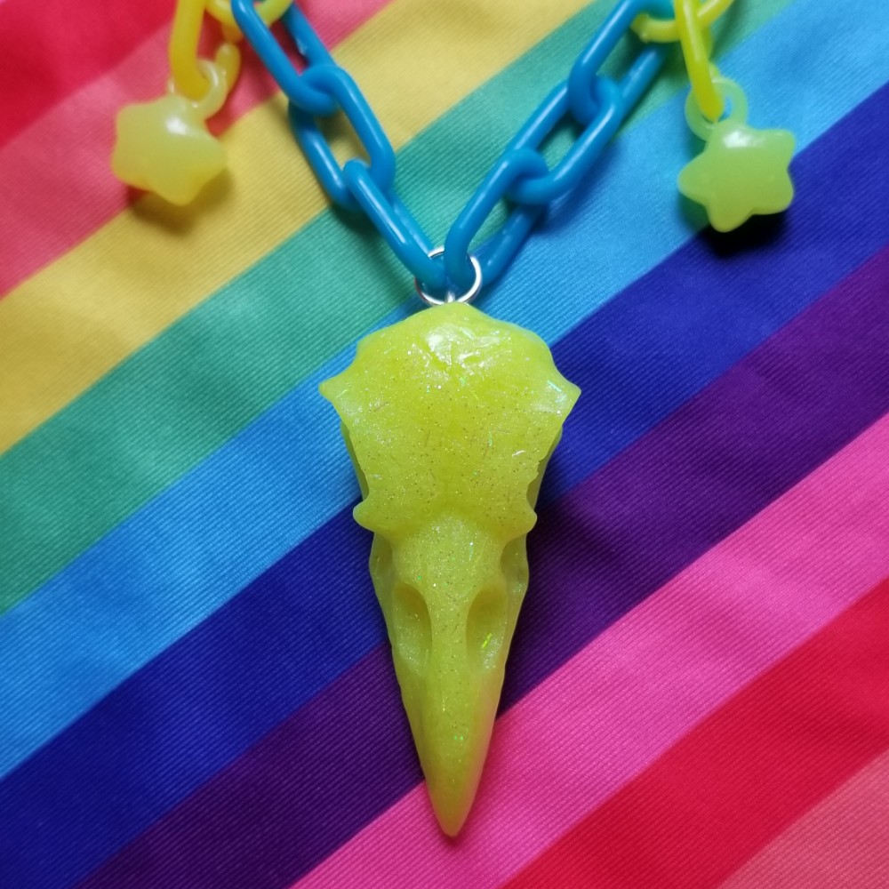 This necklace features a neon yellow glittery bird skull thats about 2" x 1" on a 21" plastic chain