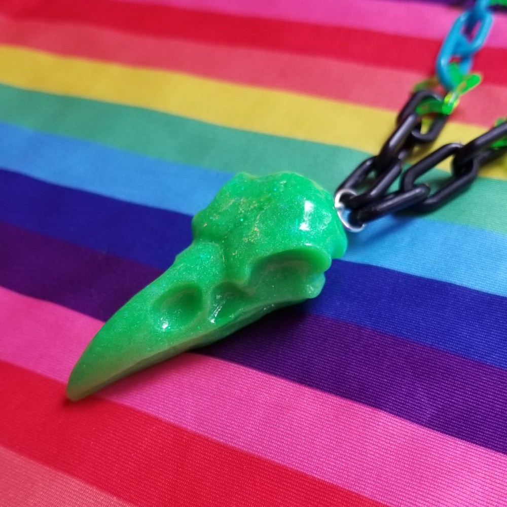 This necklace features a neon green glittery bird skull thats about 2" x 1" on a 19" plastic chain