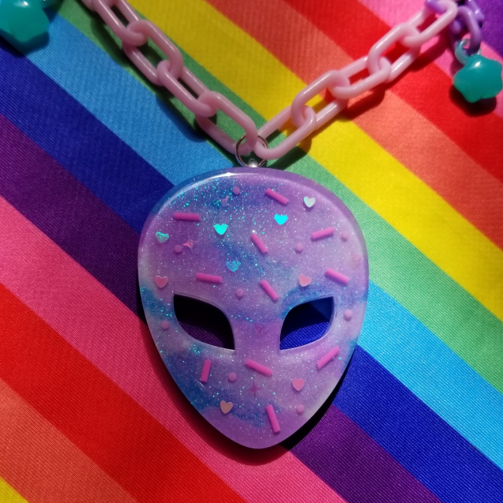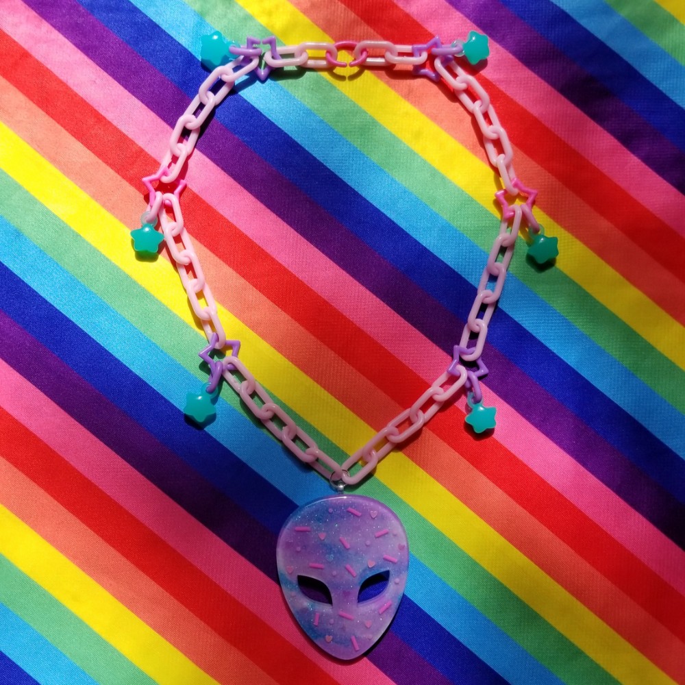 This necklace features a pastel blue, purple, and pink alien thats about 2.5" x 2" on a 20" pastel pink plastic chain