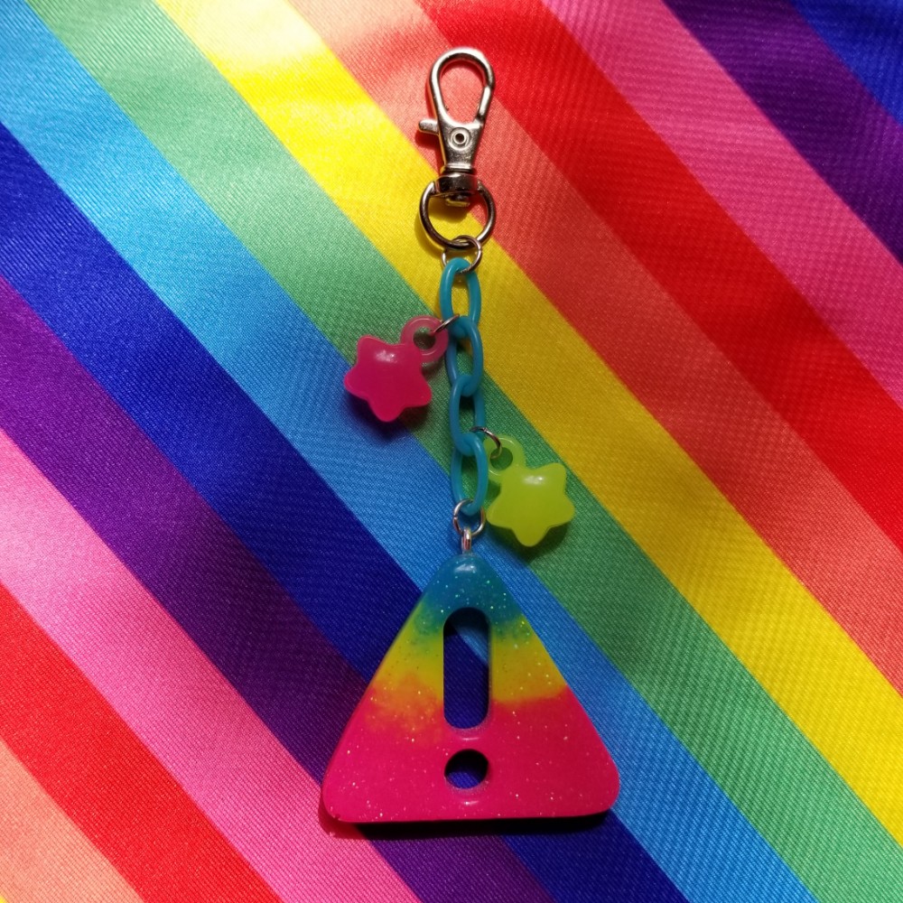This keychain features a pink yellow and blue hazard sign thats about 1.5" x 1.5" on a plastic chain