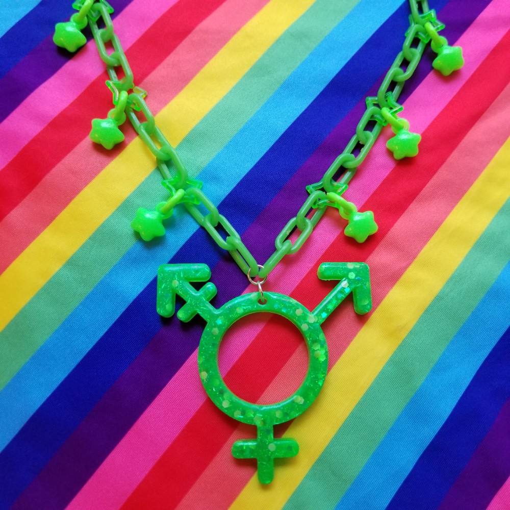This necklace features a neon green glittery trans symbol thats about 3" x 3" on a 21" plastic chain