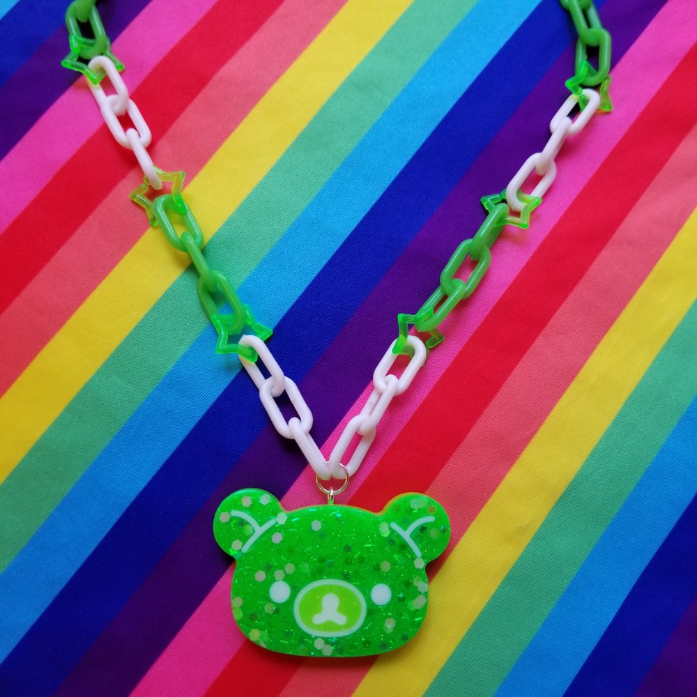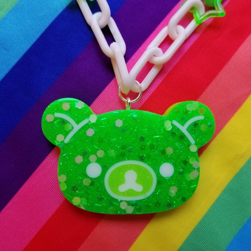 This necklace features a glittery neon green rilakkuma thats about 2.5" x 1.5" on a 21" plastic chain