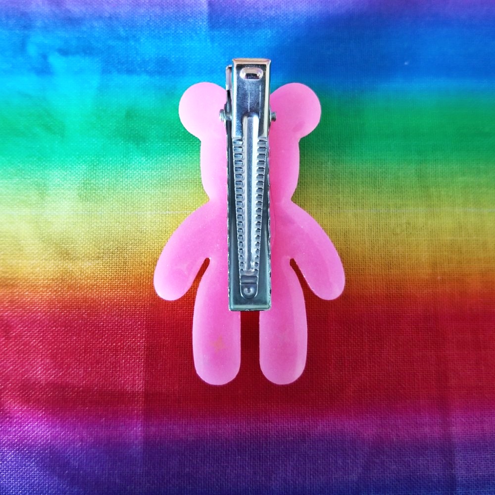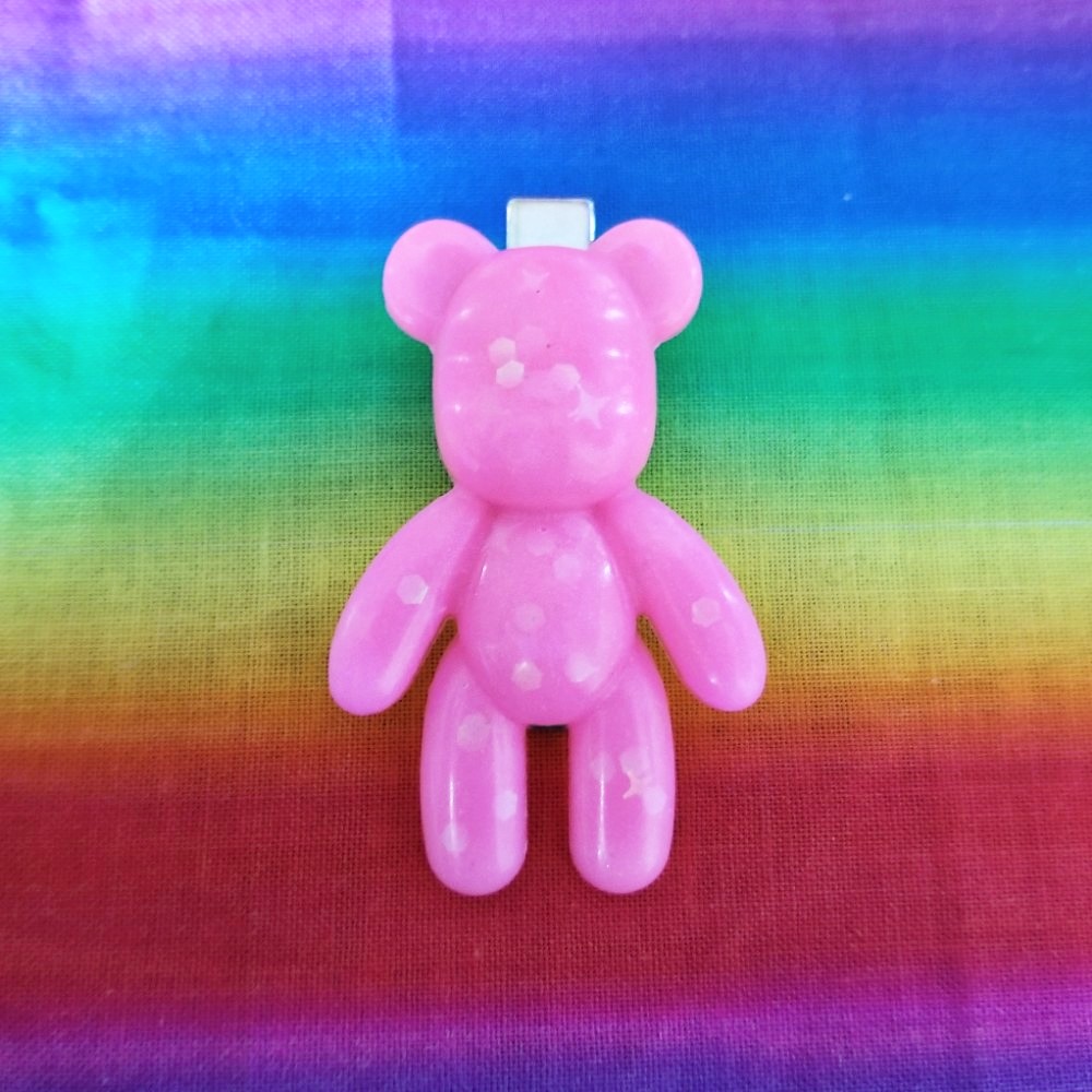 This bear is about 2" x 1" and is pastel pink with holographic glitter