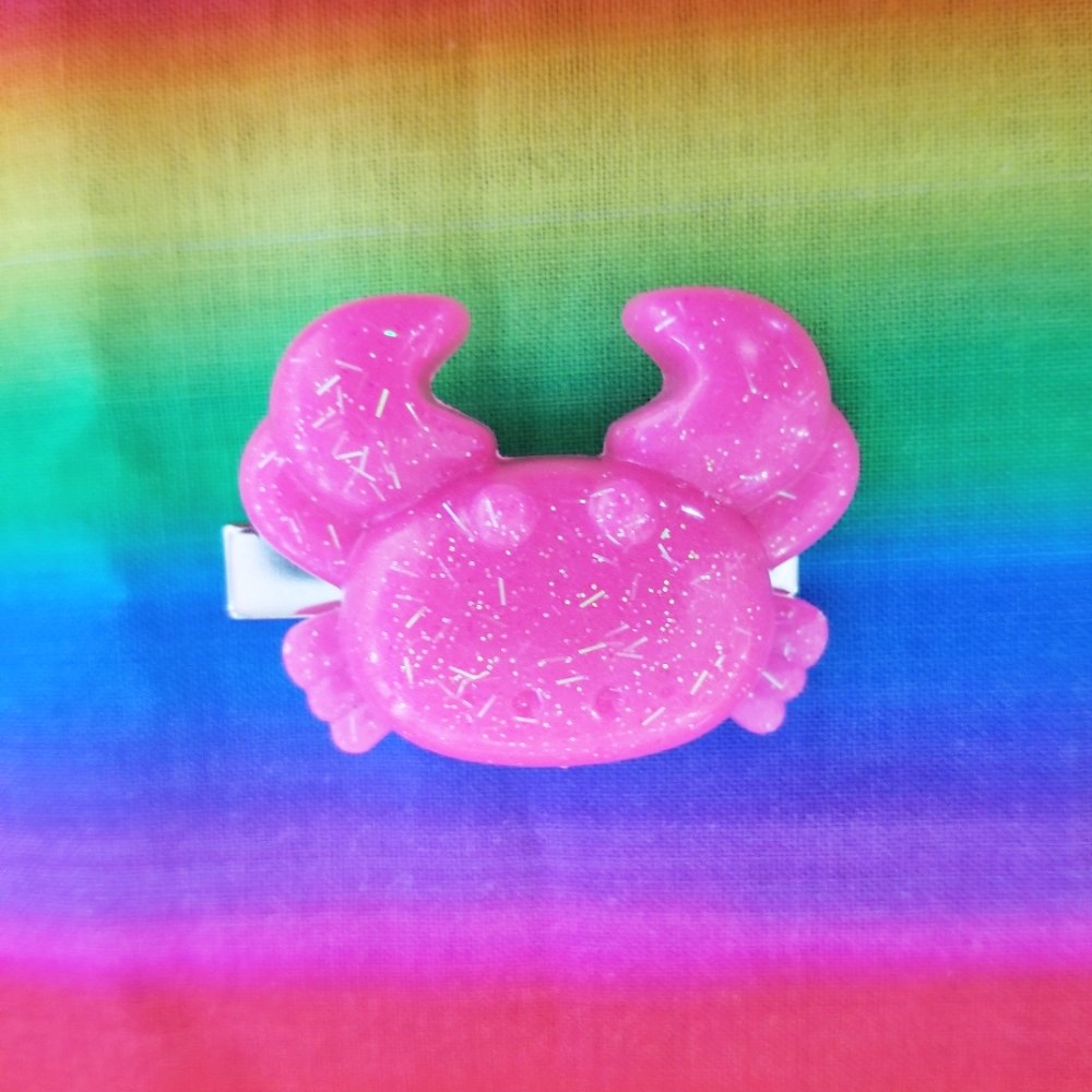 This crab is about 1.5" x 1.5" and features holographic glitter