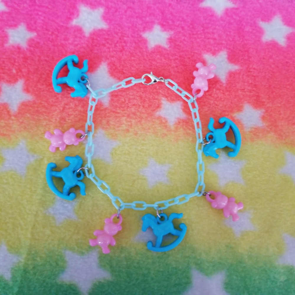 This bracelet is 9" long and features pastel blue rocking horse charms and pastel pink bear charms on a pastel blue plastic chain