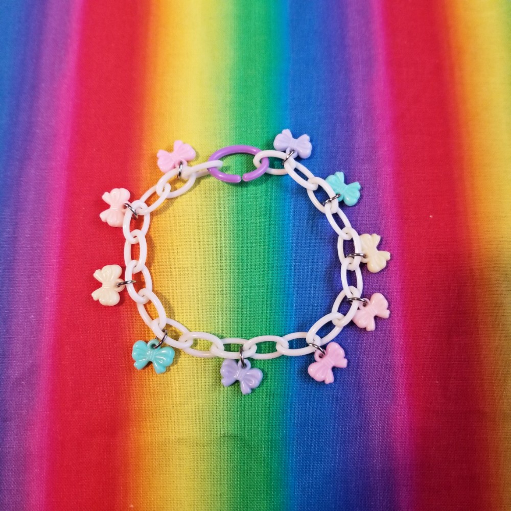 This bracelet is 8" long and features pastel rainbow bow charms on a white plastic chain