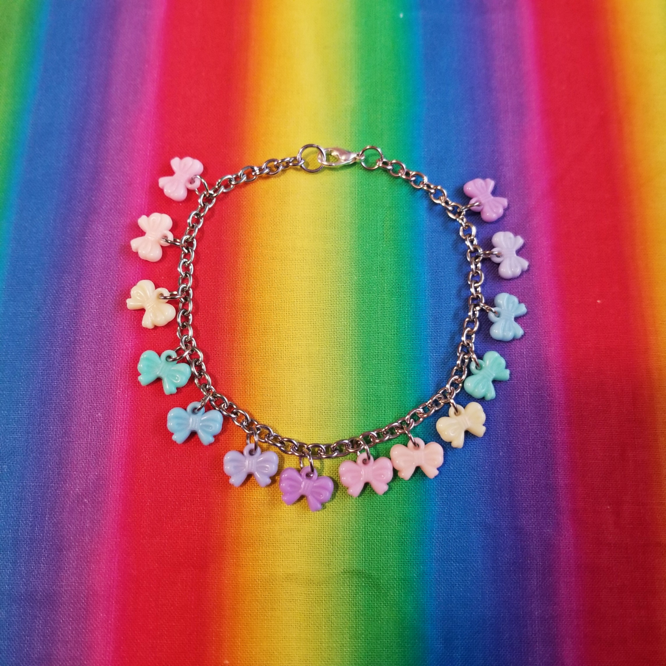 This bracelet is 9" long and features pastel rainbow bow charms on a silver chain