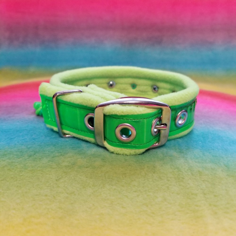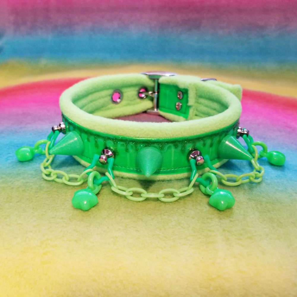 This collar is made of lime green fleece with green reflective tape with slime drips and features neon green resin spikes and green plastic chain.