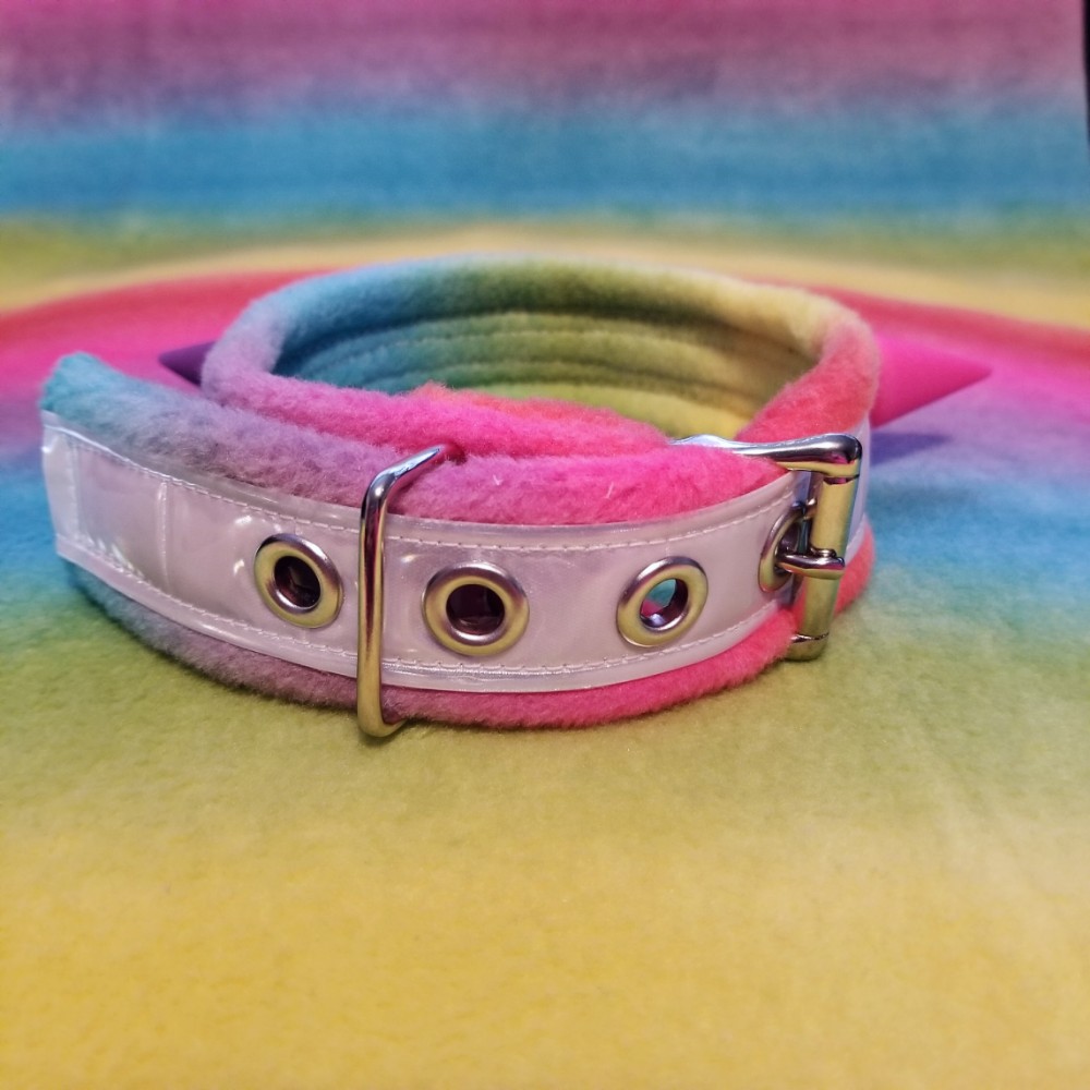 This collar is made of rainbow fleece with white reflective vinyl and features neon matte resin spikes.
