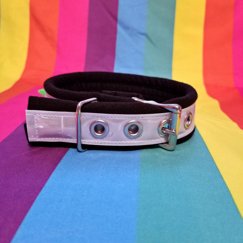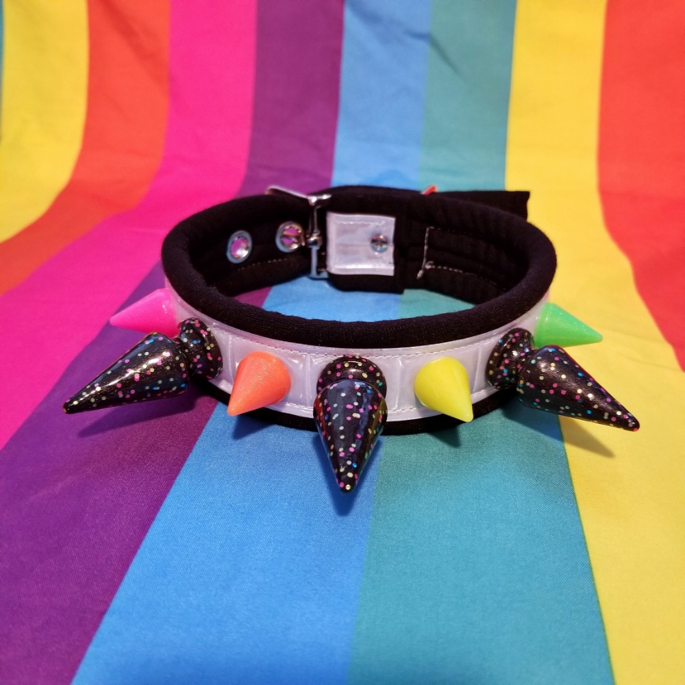 This collar is about 1.5" wide and features a black base with white reflective tape, black resin confetti spikes, and rainbow resin spikes.