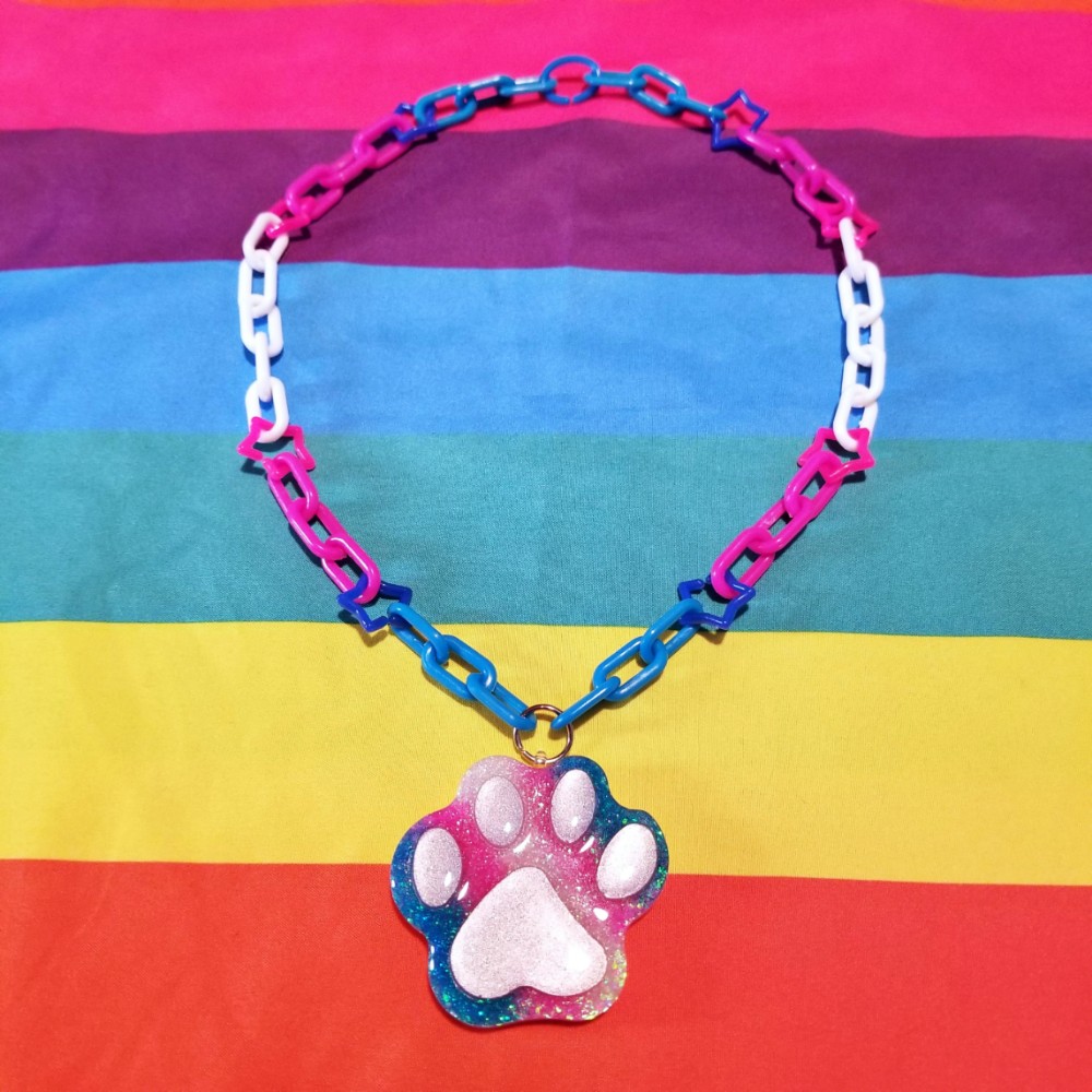 This paw print is about 2" x 2" and features a glittery trans flag base with iridescent paw pads on a 20" plastic chain