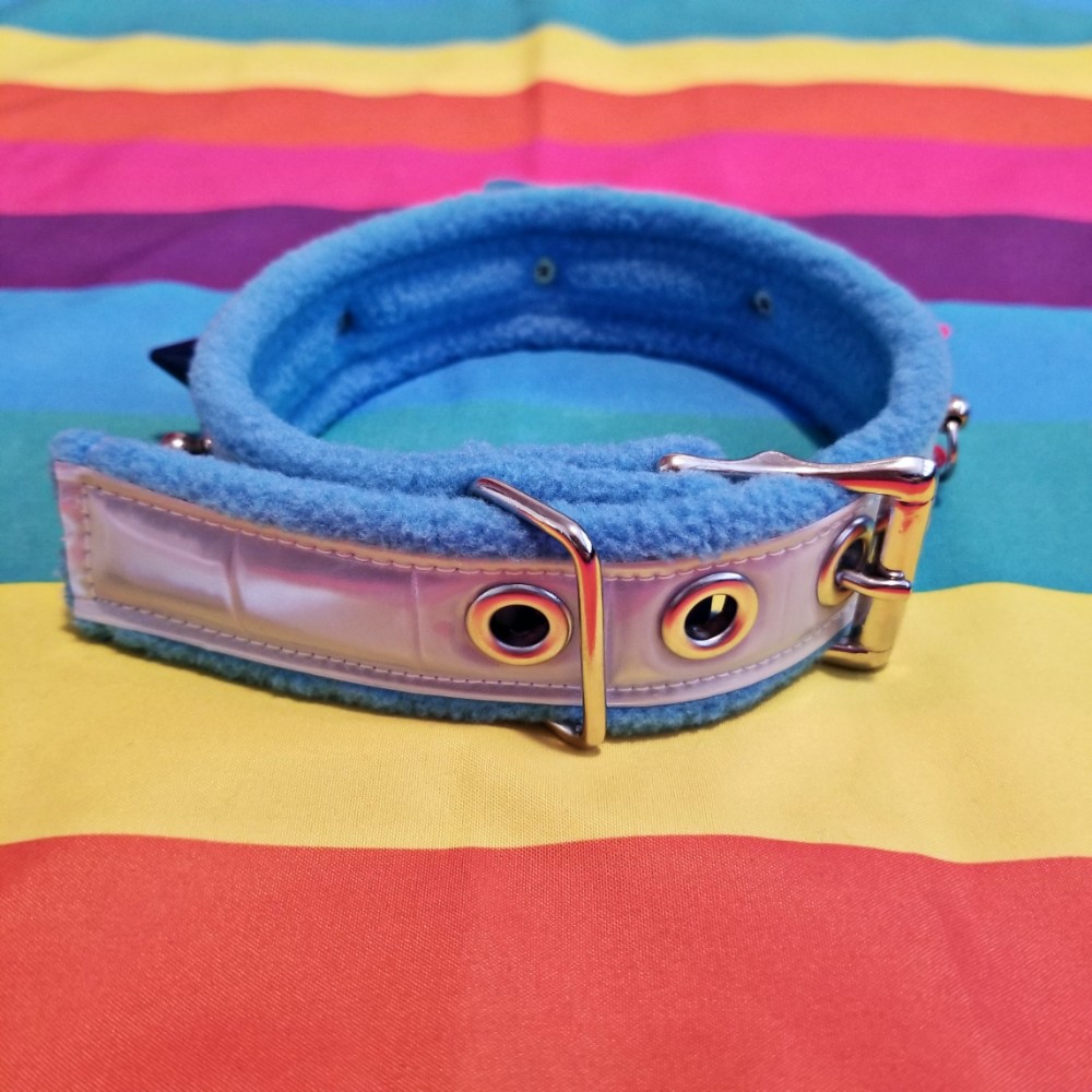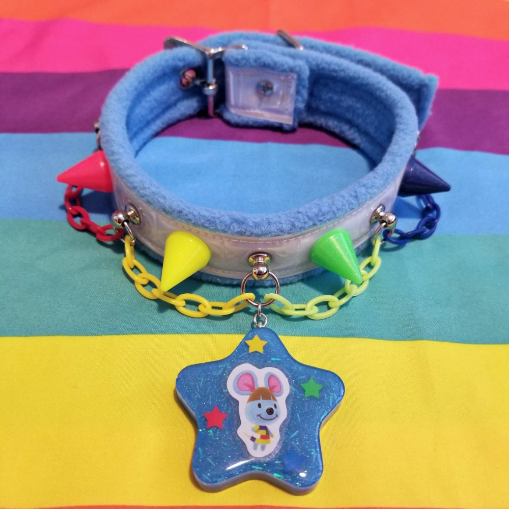 This collar is about 1.25" wide and features a bright blue fleece base with white reflective tape, red/yellow/green/blue spikes with matching chain, and a star pendant with broccolo from animal crossing