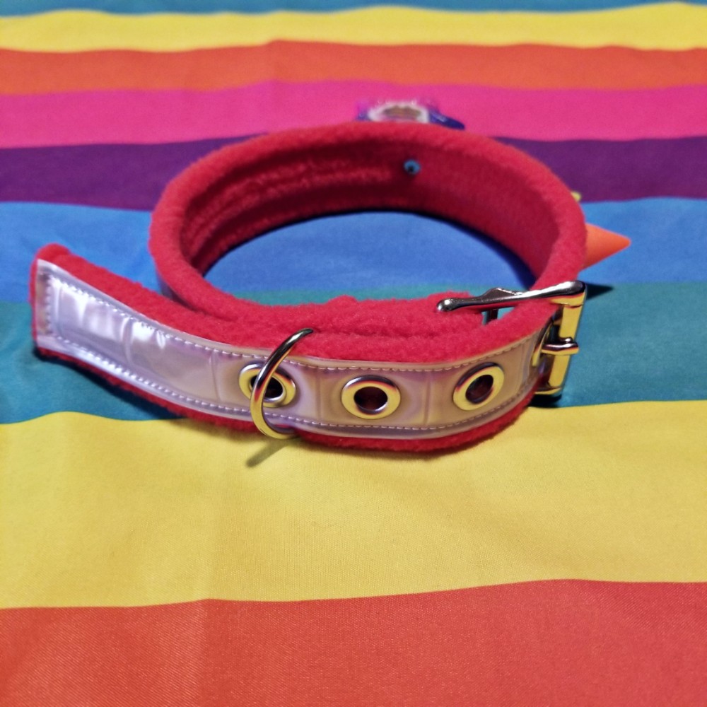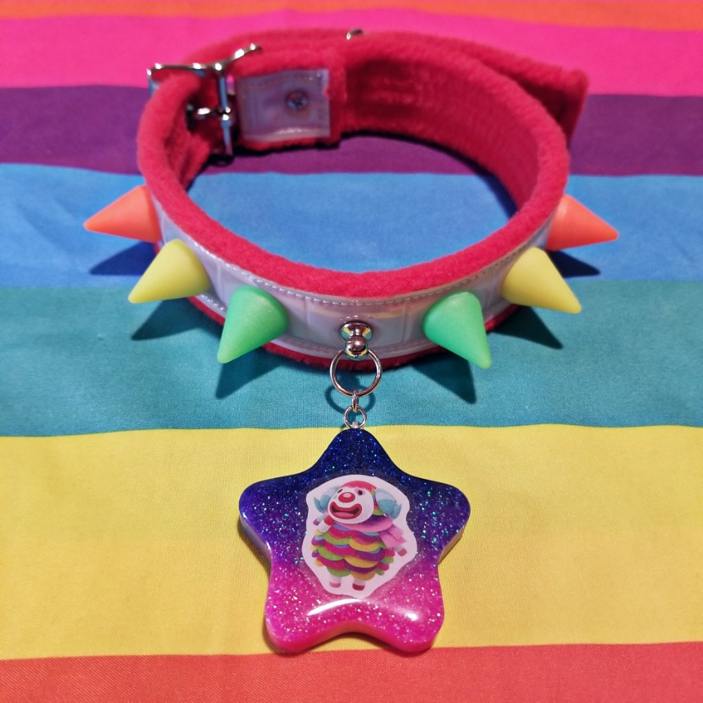 This collar is about 1.25" wide and features a red fleece base with white reflective tape, orange/yellow/green matte spikes, and a star pendant with pietro from animal crossing