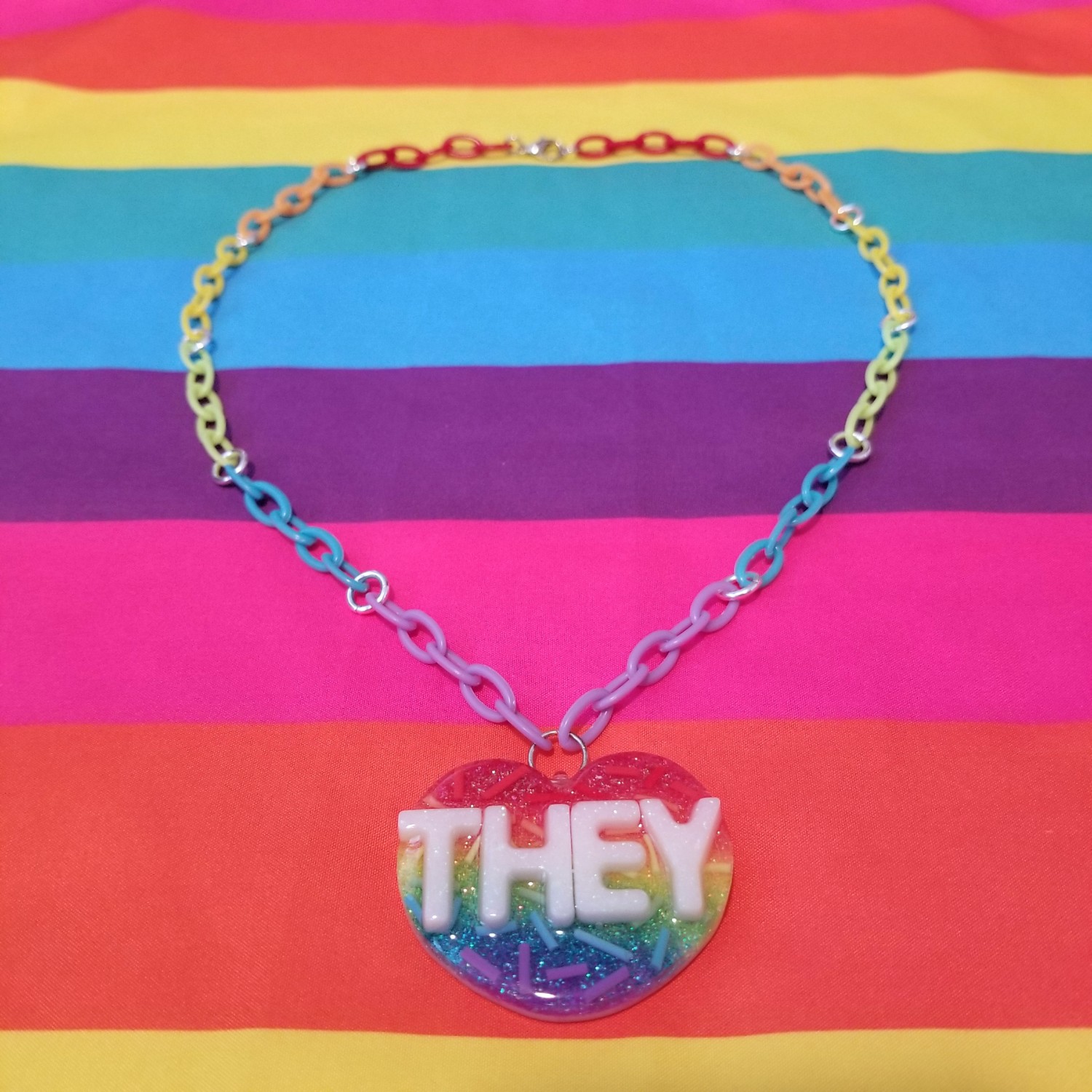 This necklace features a rainbow glittery pendant that's 2" x 1.5" with white They pronoun on a 24" plastic chain