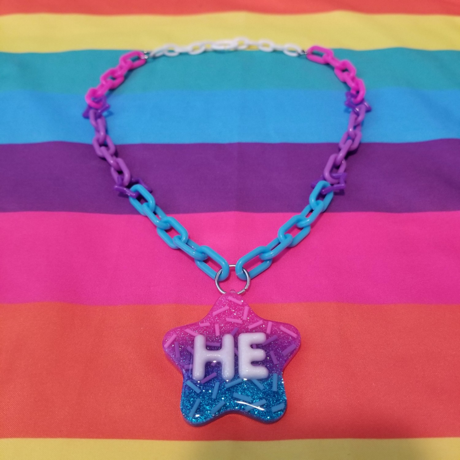 This necklace features a glittery bi flag colored pendant with He pronoun that's about 2" x 2" on a 20" plastic chain
