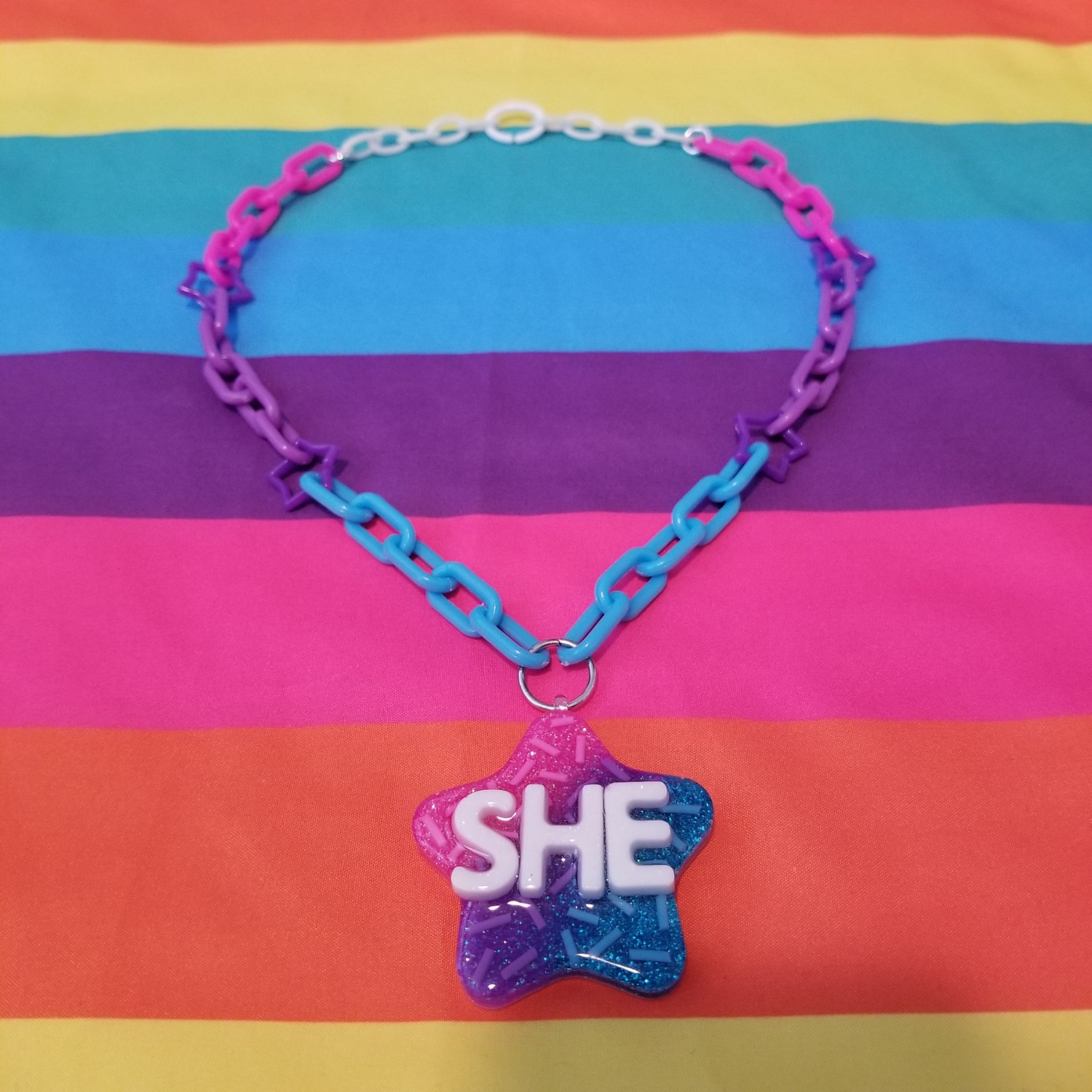 This necklace features a glittery bi flag colored pendant with She pronoun that's about 2" x 2" on a 20" plastic chain