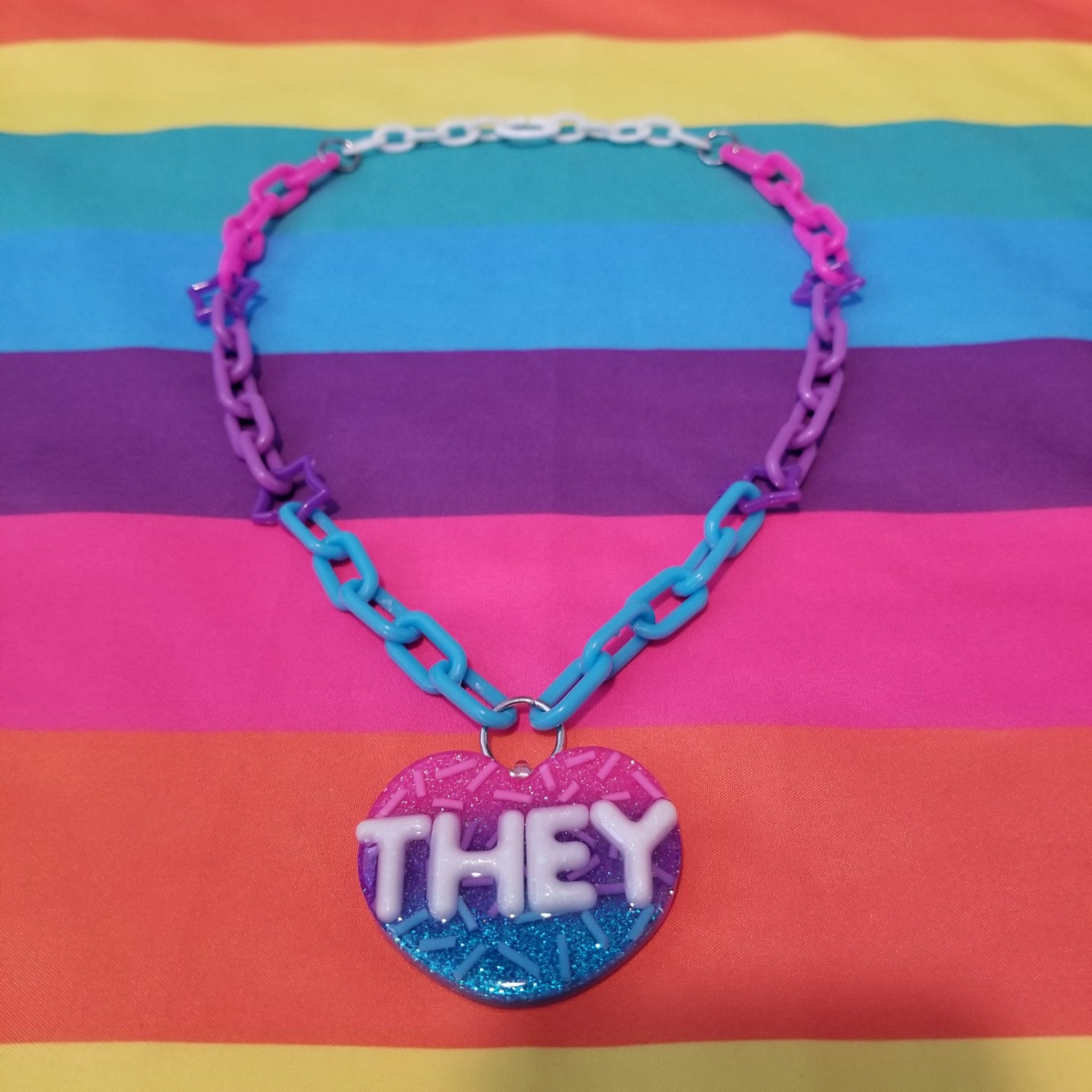 This necklace features a glittery bi flag colored pendant with They pronoun that's about 2" x 1.5" on a 20" plastic chain
