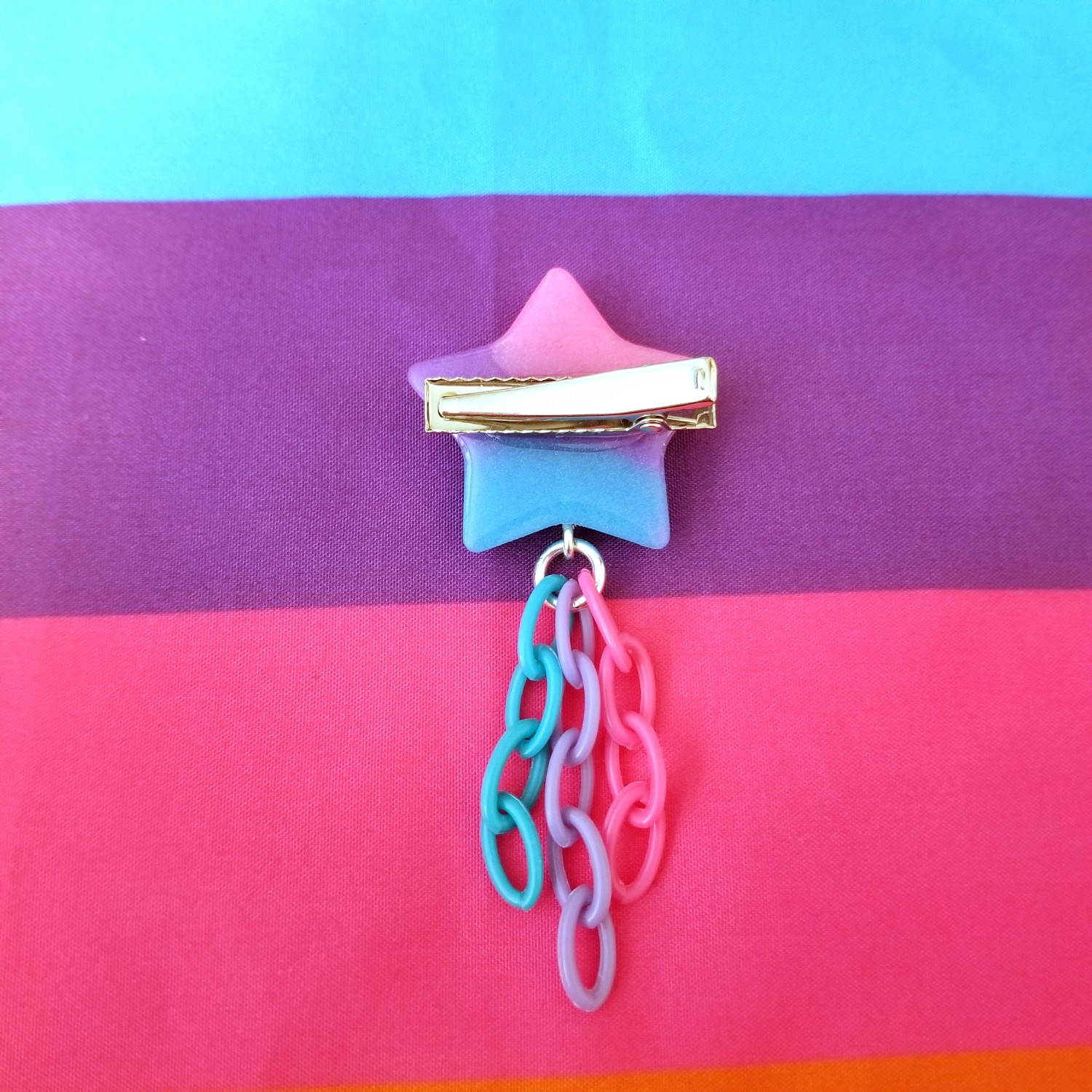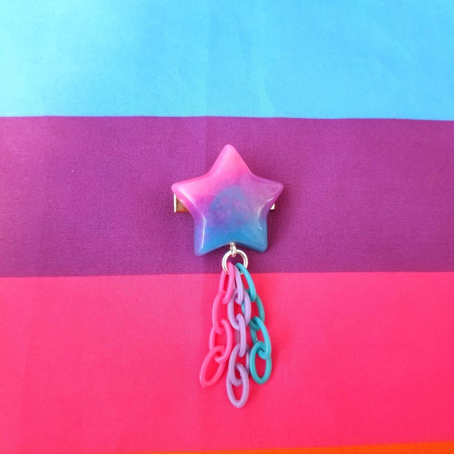 This hair clip features a bi flag colored star with plastic chain that's about 1" x 3"
