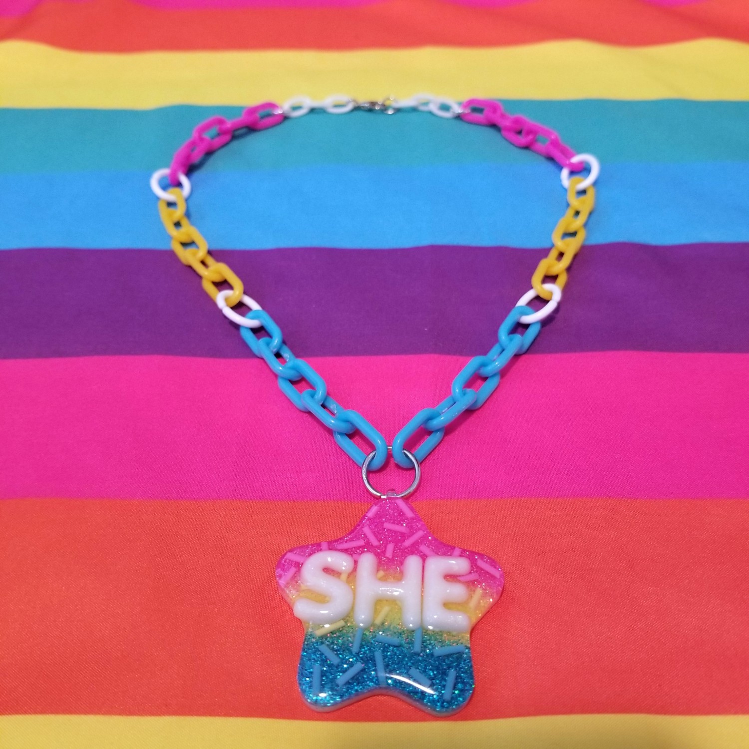 This necklace features a glittery pan flag colored pendant with She pronoun that's about 2" x 2" on a 20" plastic chain