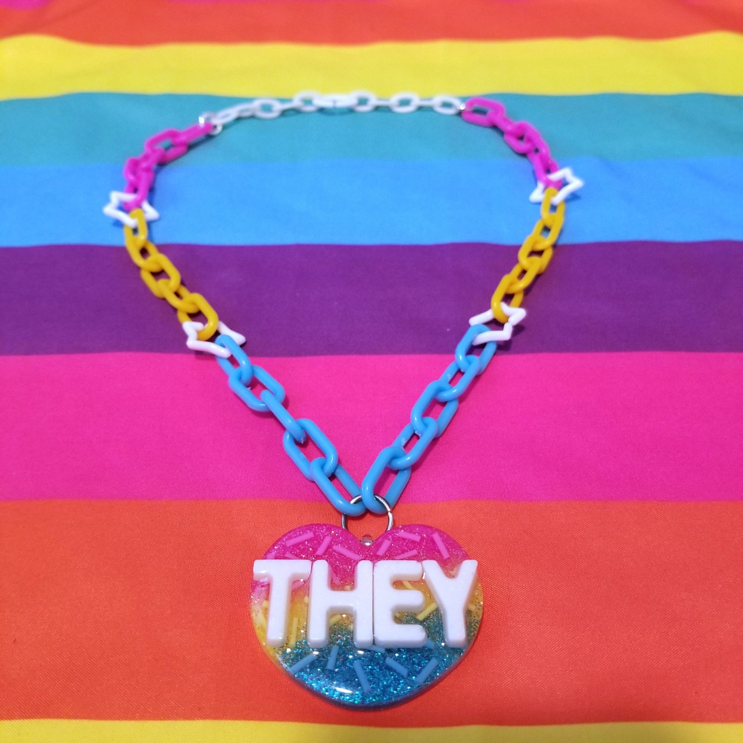 This necklace features a glittery pan flag colored pendant with They pronoun that's about 2" x 1.5" on a 20" plastic chain