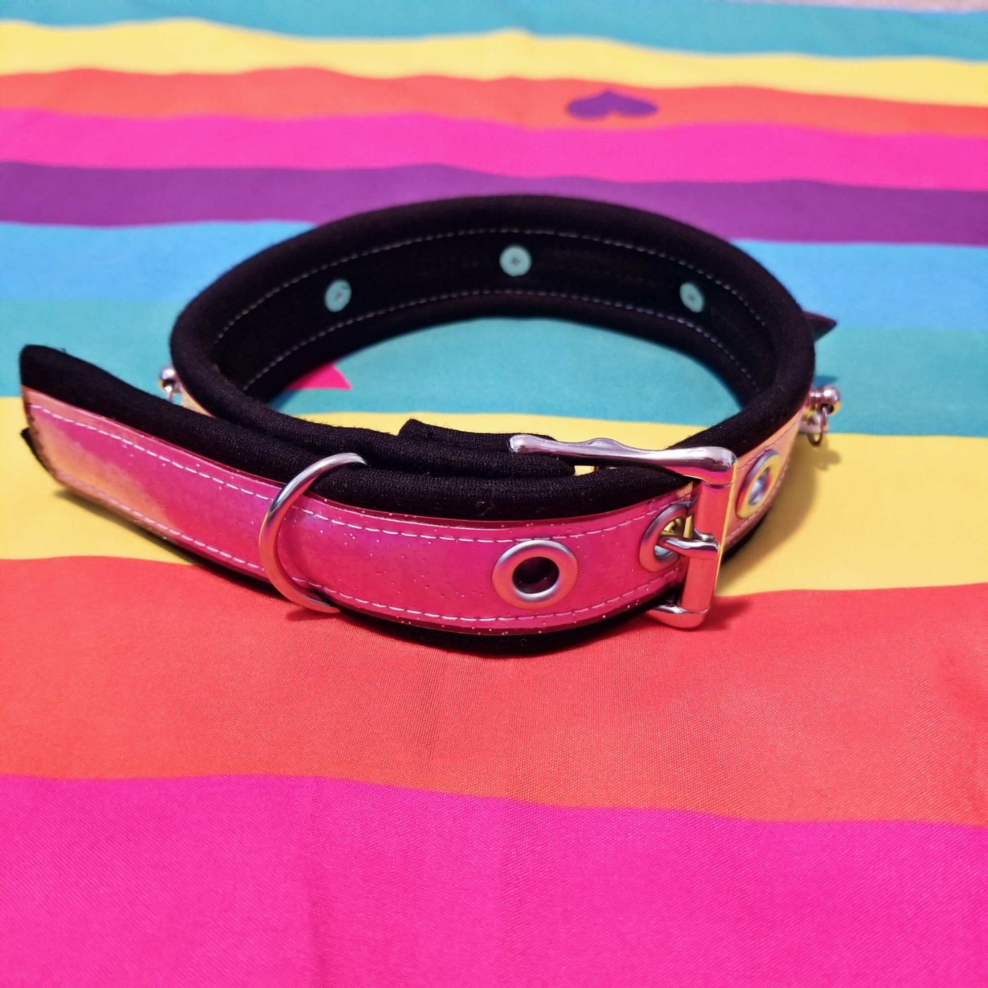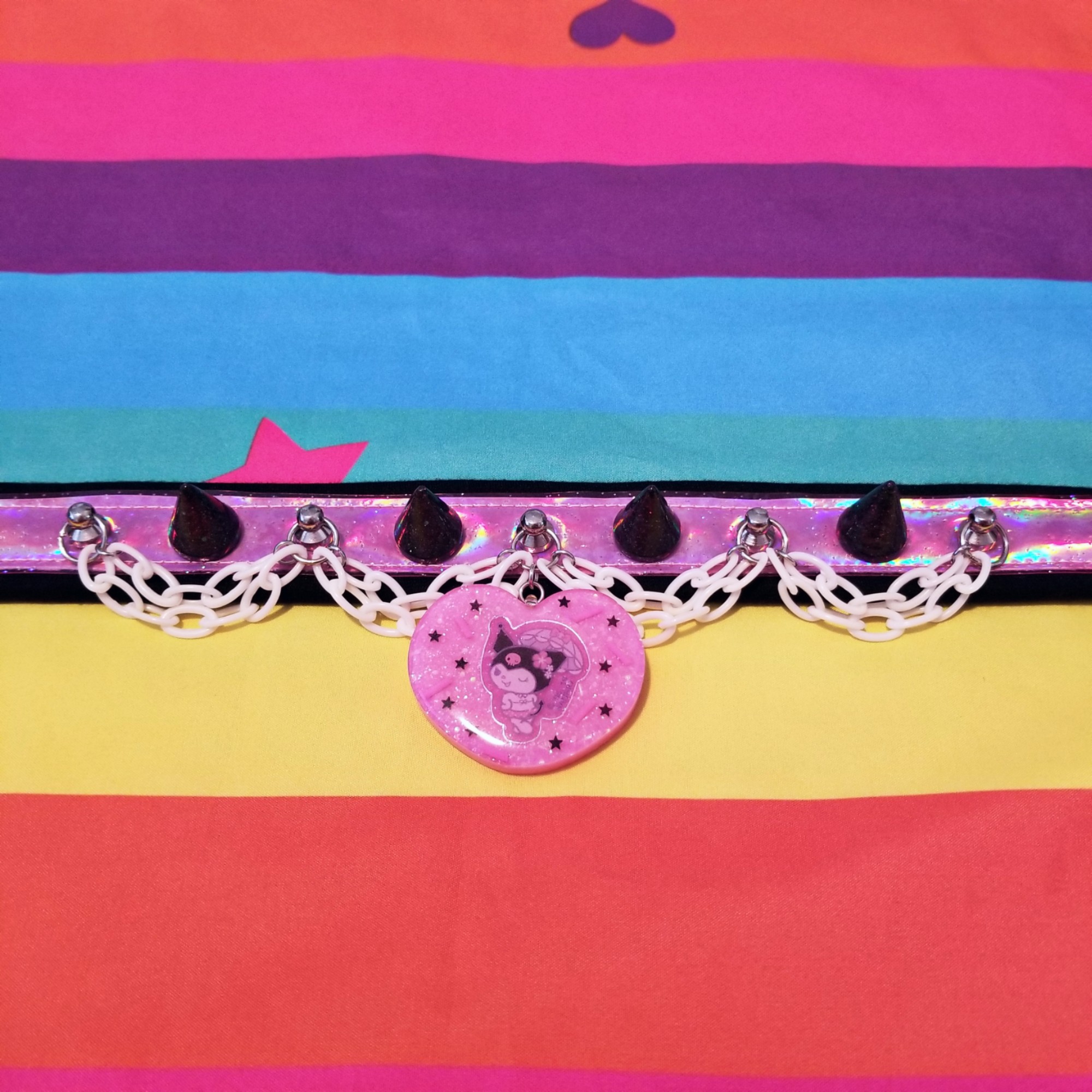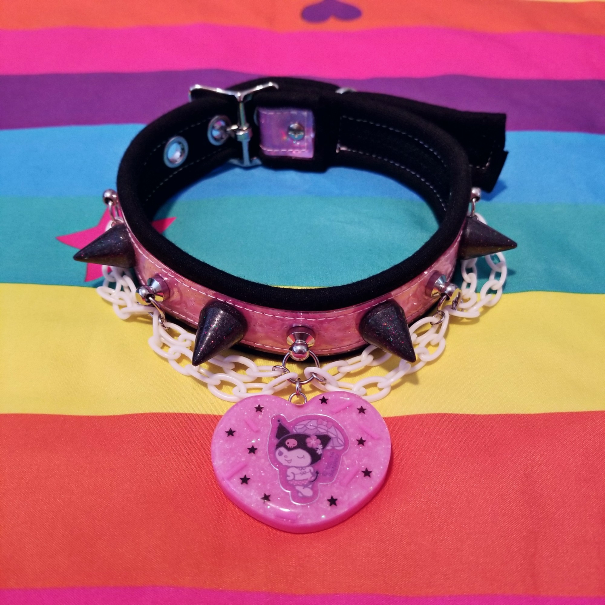 This collar is 1.25" wide and features a black fabric base with glittery pink holographic vinyl, black glittery resin spikes, and a kuromi pendant. It is adjustable in length to 13", 14", and 15".
