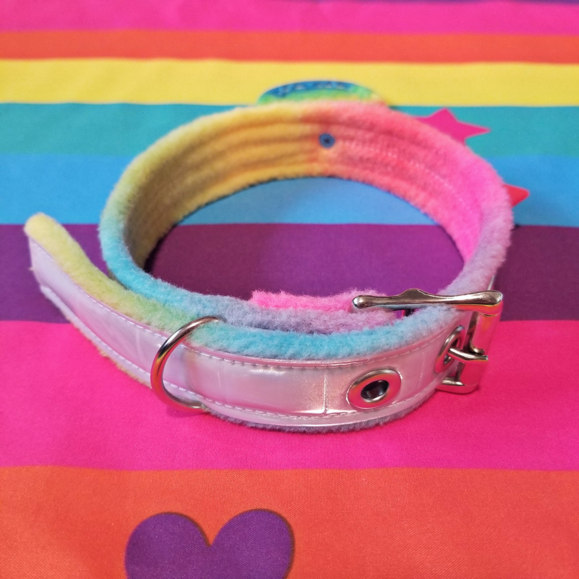 This collar is 1.25" wide and features a rainbow fleece base with white reflective vinyl, a rainbow resin smiley face pendant, and neon resin spikes. It is adjustable in length to 13", 14", and 15".