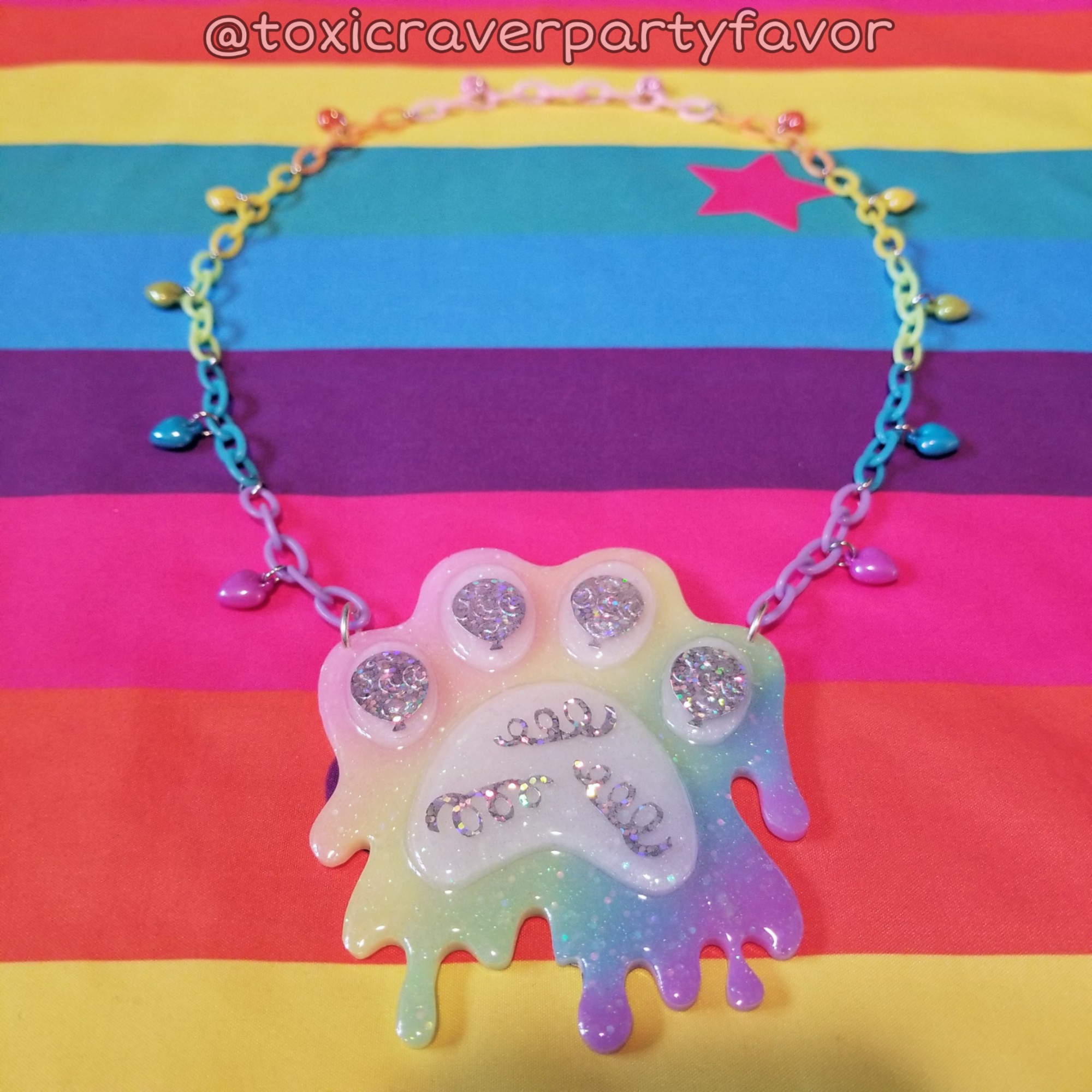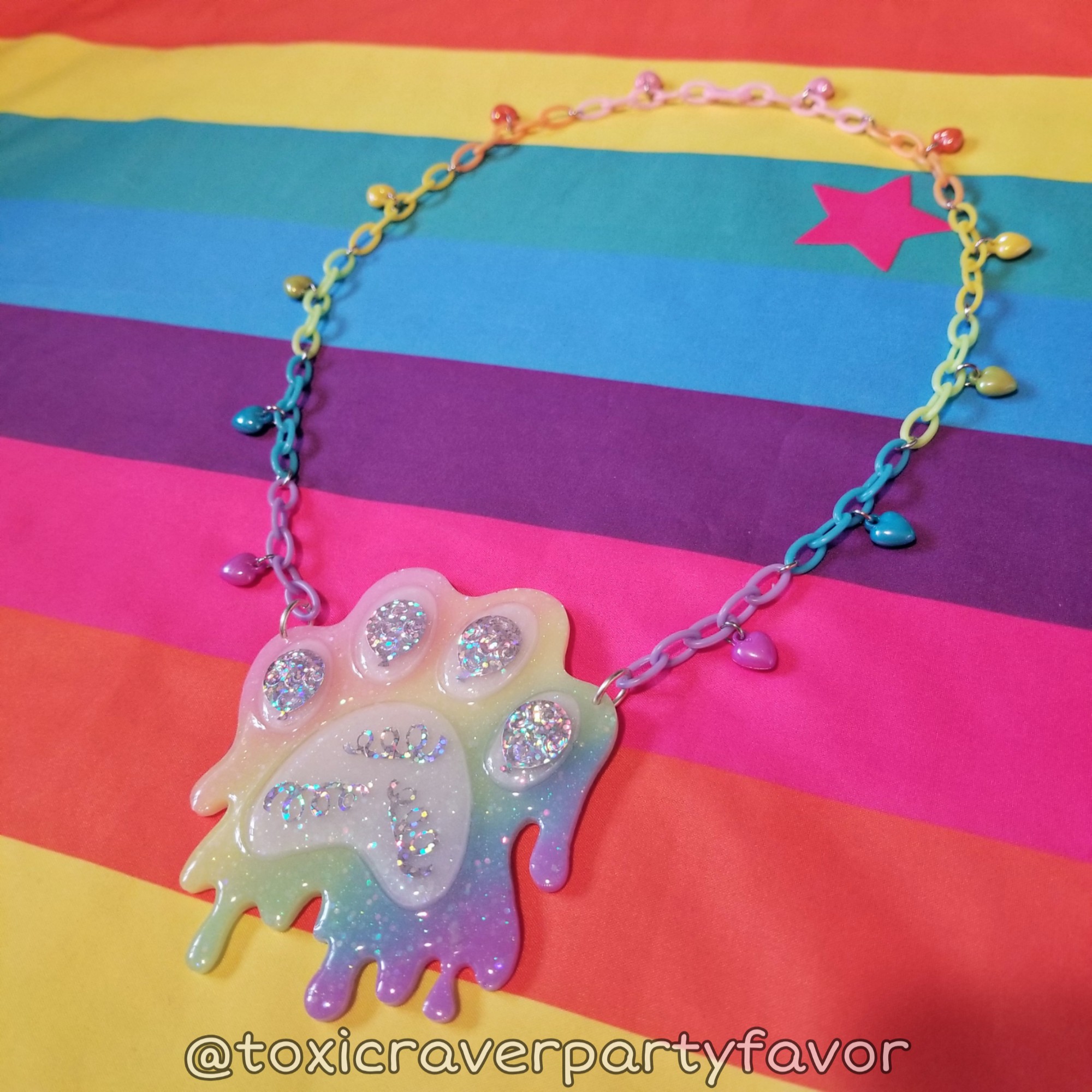 This necklace is 22" long and features a holographic pastel rainbow base with white paw pads and holographic balloons and confetti on a pastel rainbow plastic chain, the paw is about 3.5" x 4".