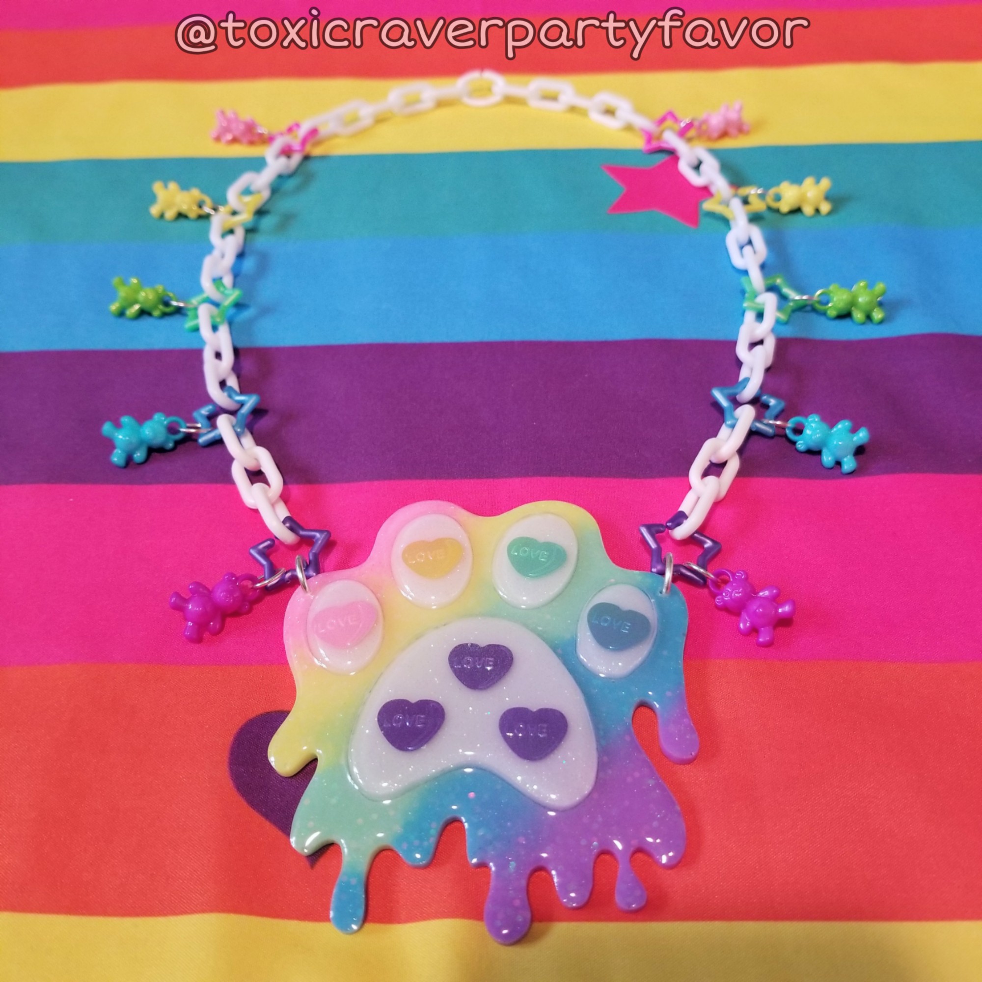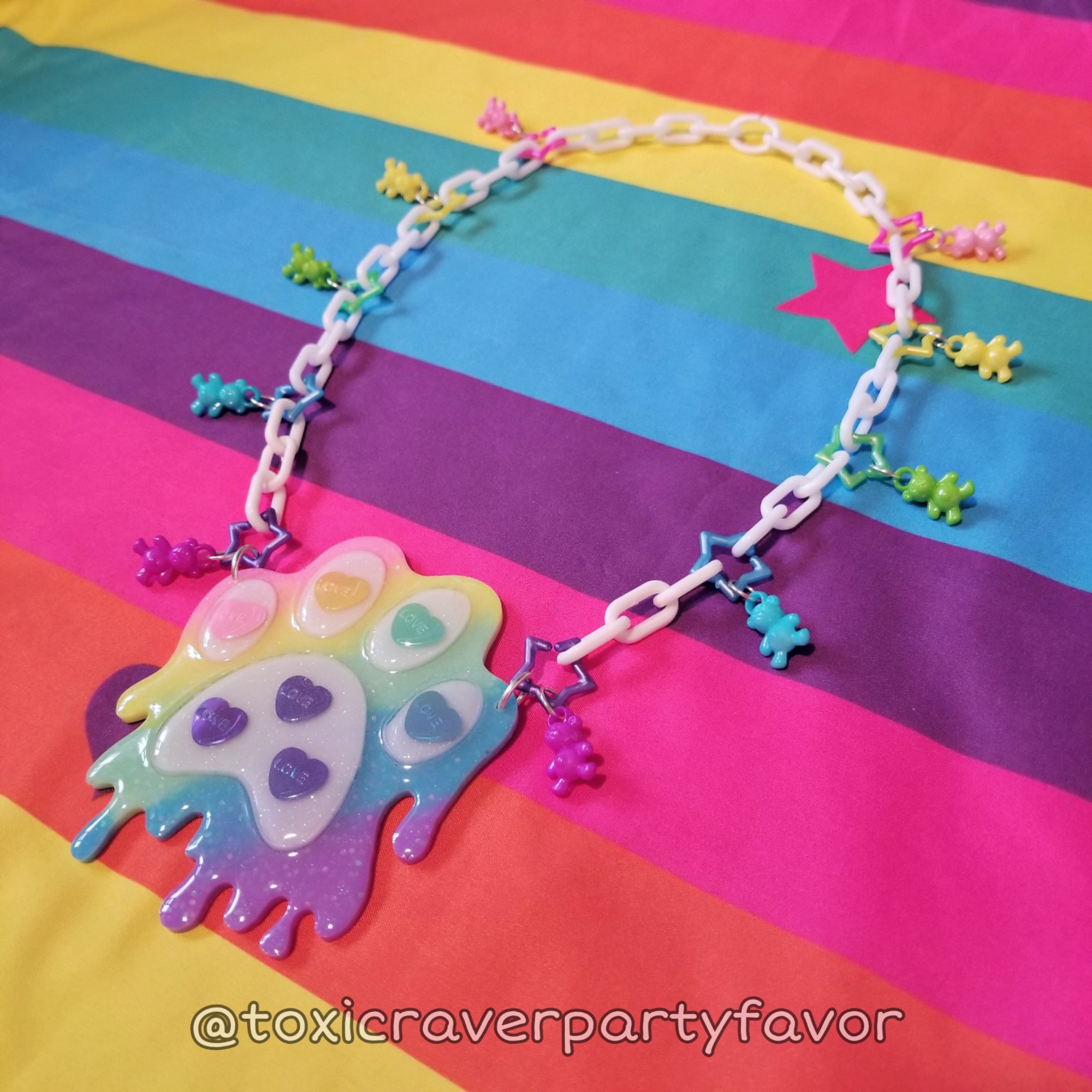 This necklace is 20" long and features a holographic pastel rainbow base with white paw pads and holographic love hearts on a white plastic chain with rainbow bear charms, the paw is about 3.5" x 4".