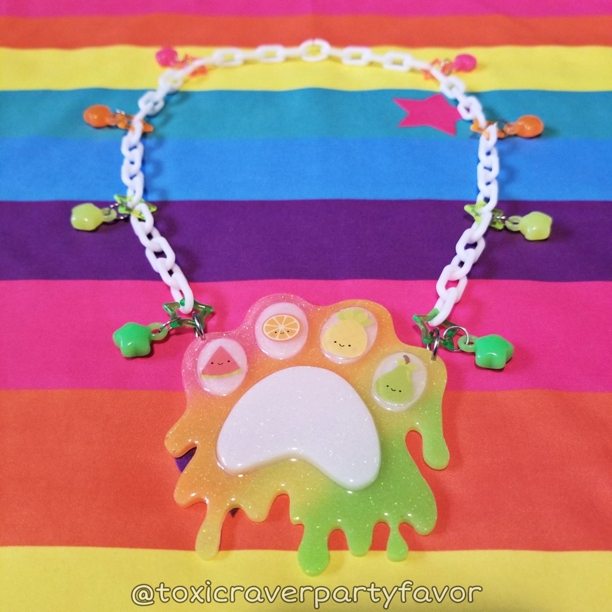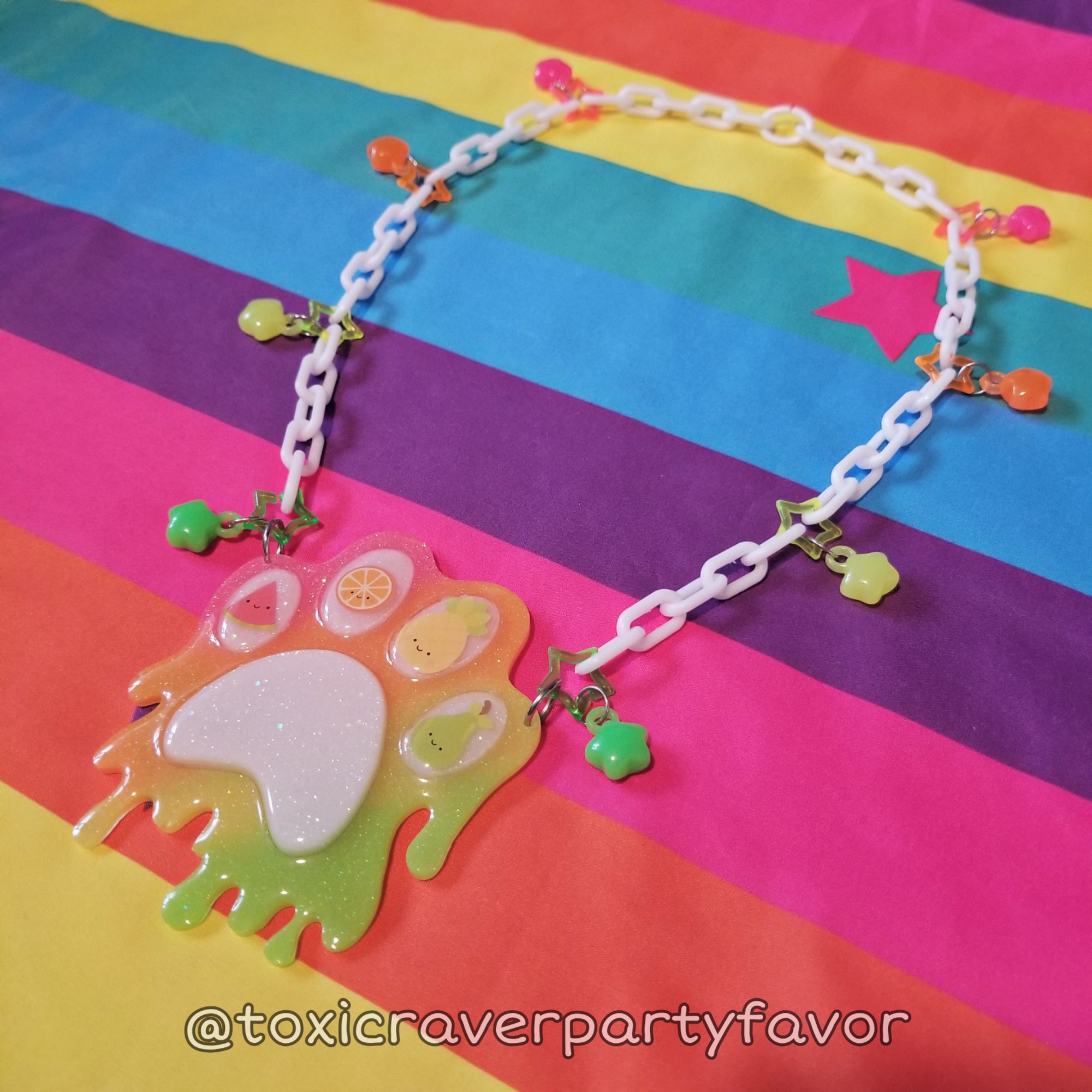 This necklace is 21" long and features a neon pink/orange/yellow/green base with white paw pads and fruits on a white plastic chain with neon star charms, the paw is about 3.5" x 4".