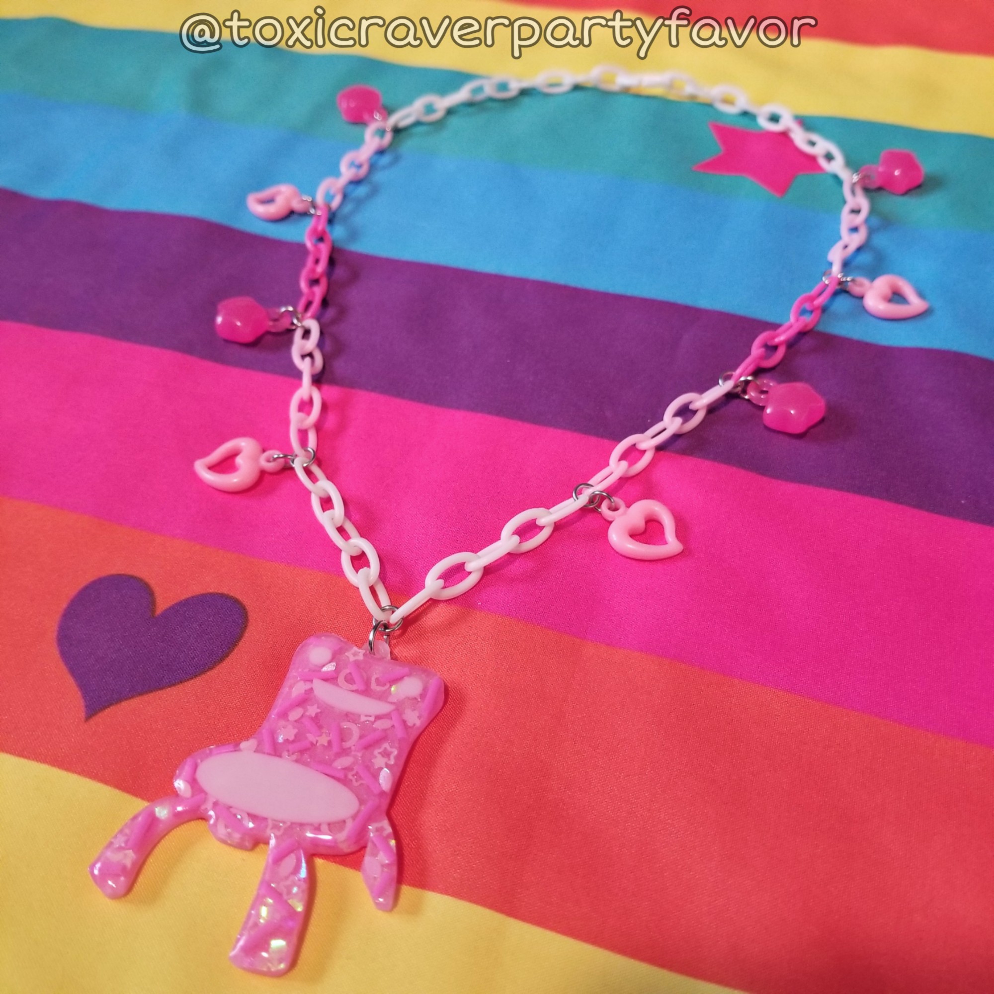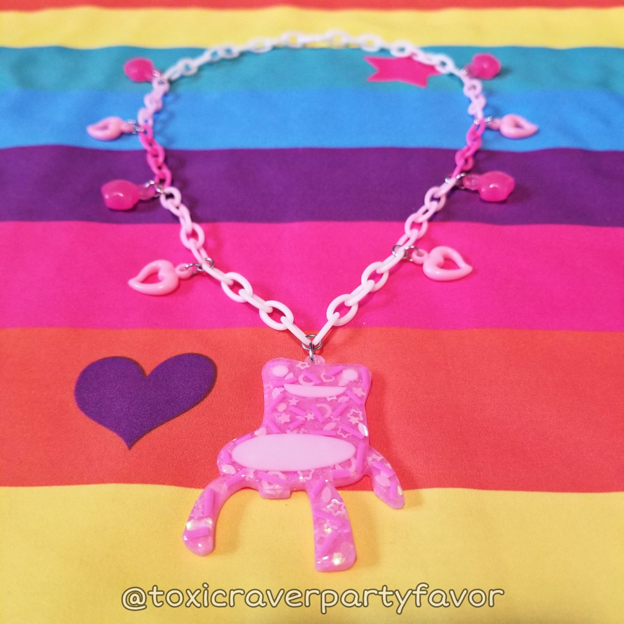 This necklace is 21" long and features a pastel pink confetti froggy chair that's about 2" x 2.5" on a pink and white plastic chain with star and heart charms