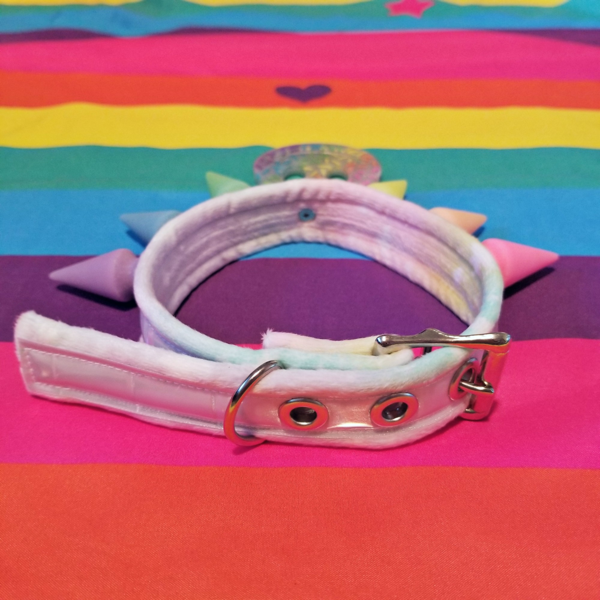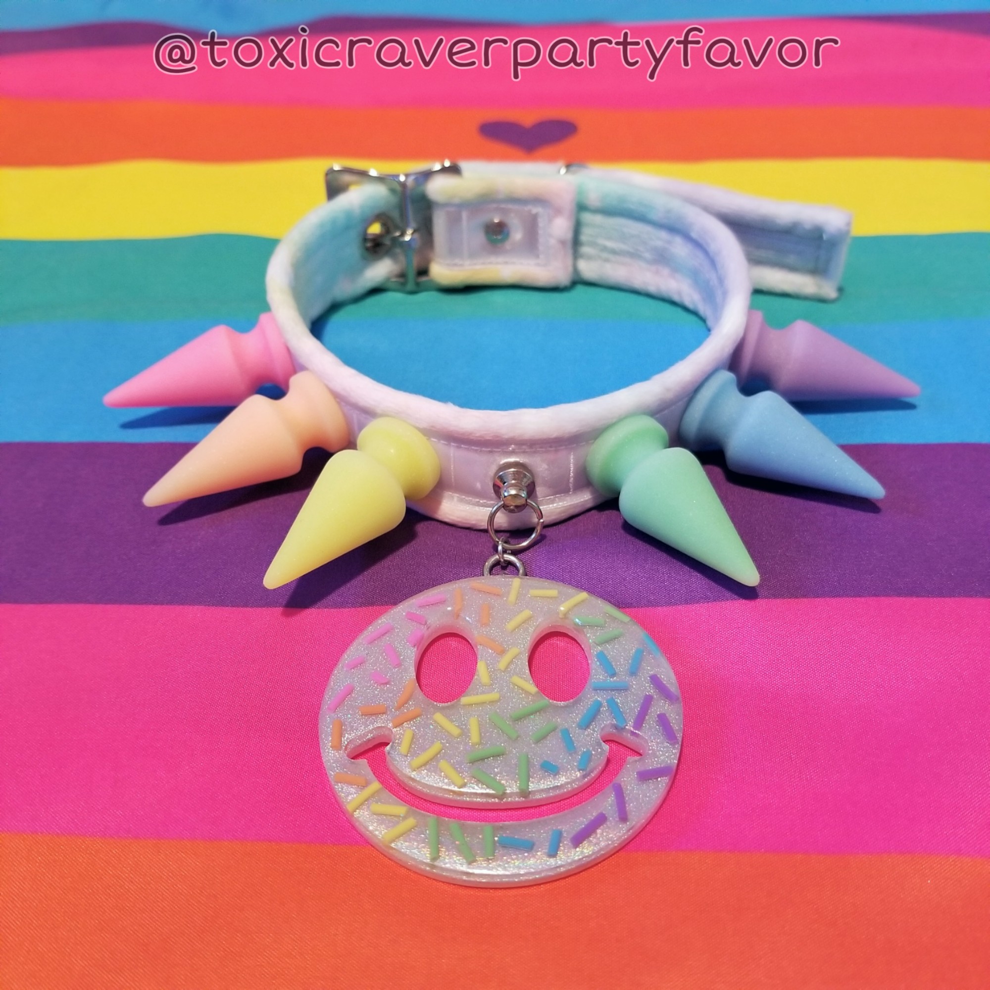 This collar is 1.25" wide and features a pastel minky fabric base with white reflective vinyl, pastel matte resin spikes, and a silver holographic smiley face pendant with rainbow sprinkles. It is adjustable in length to 13", 14", and 15".
