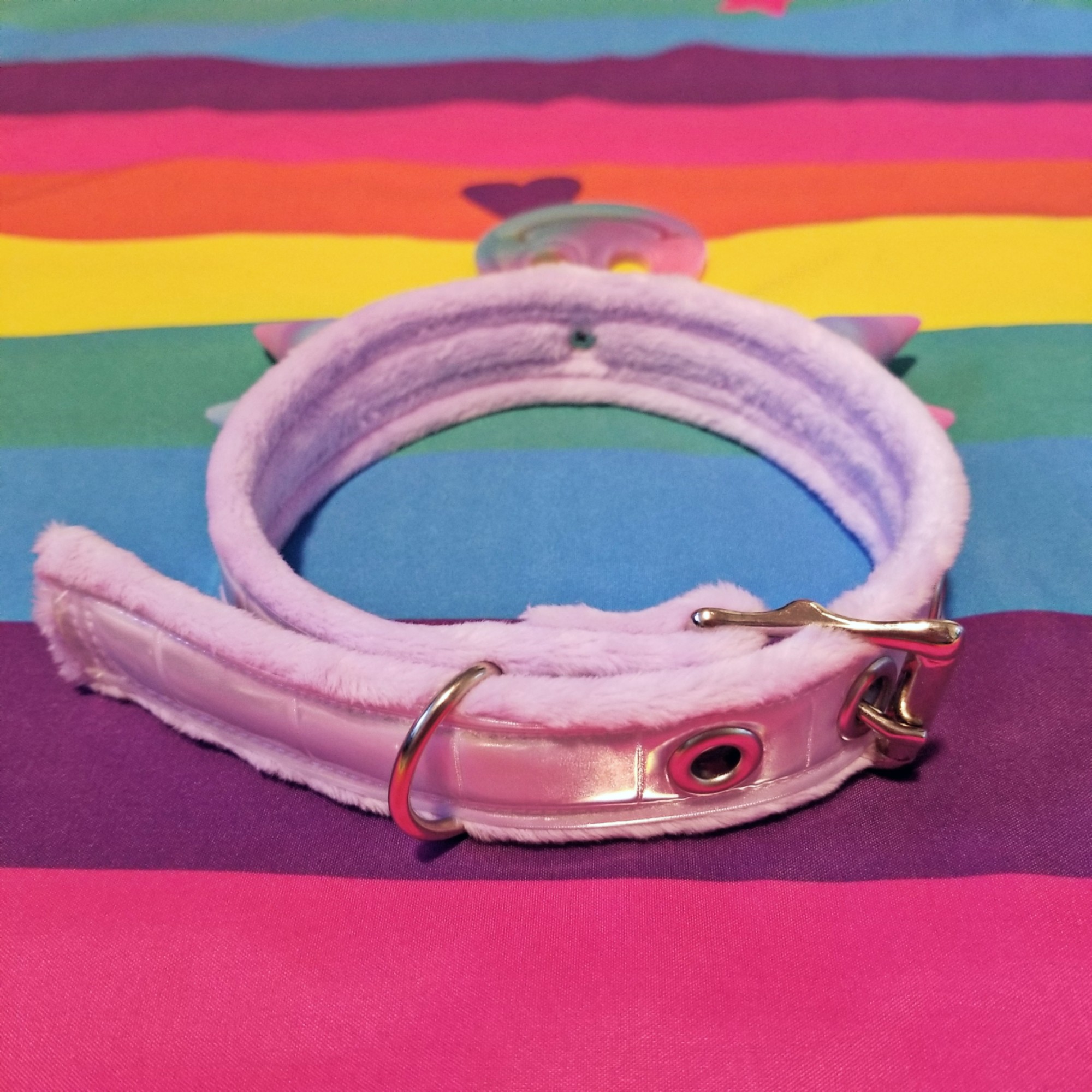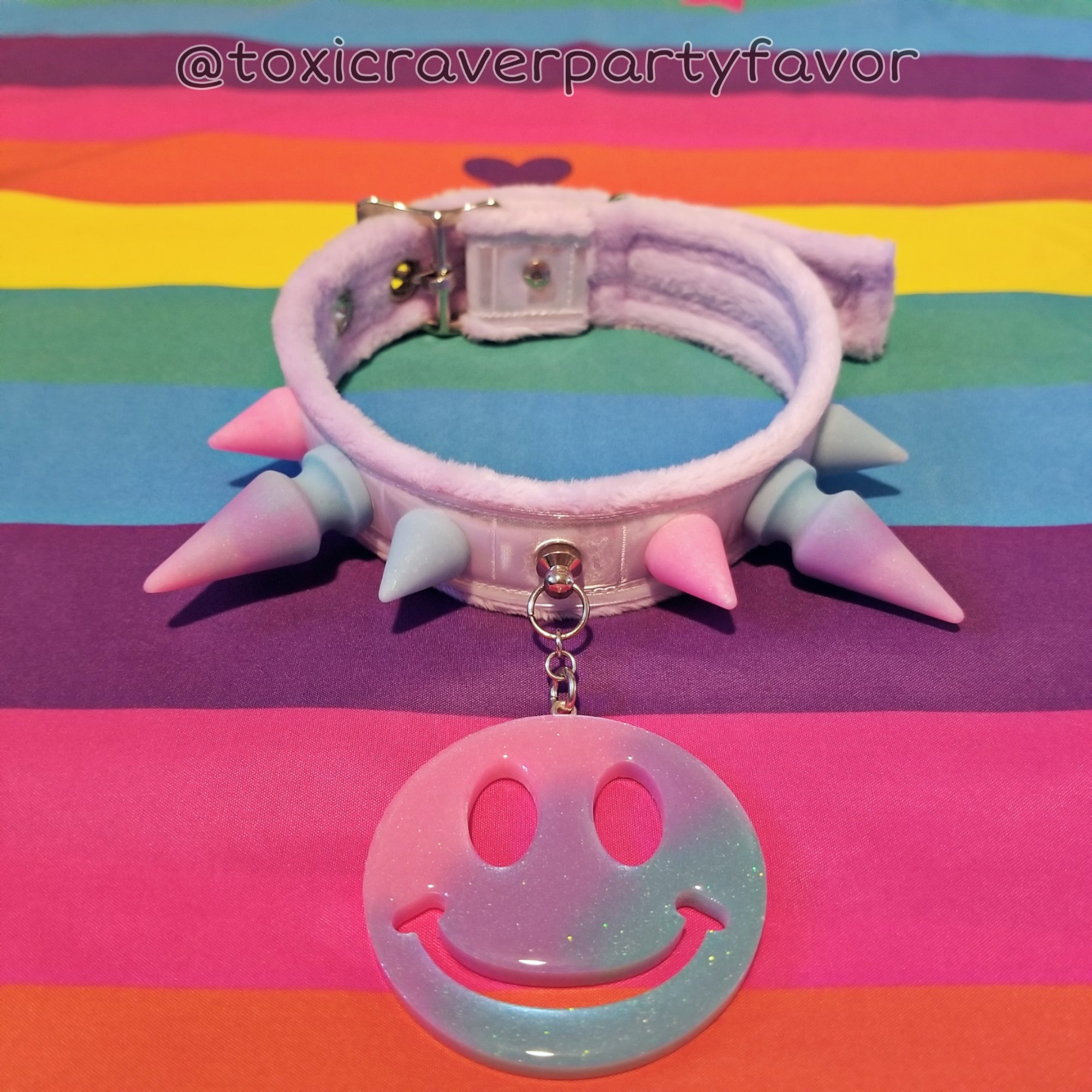This collar is 1.25" wide and features a pastel purple minky fabric base with white reflective vinyl, pastel matte resin spikes, and a pastel iridescent smiley face pendant. It is adjustable in length to 13", 14", and 15".