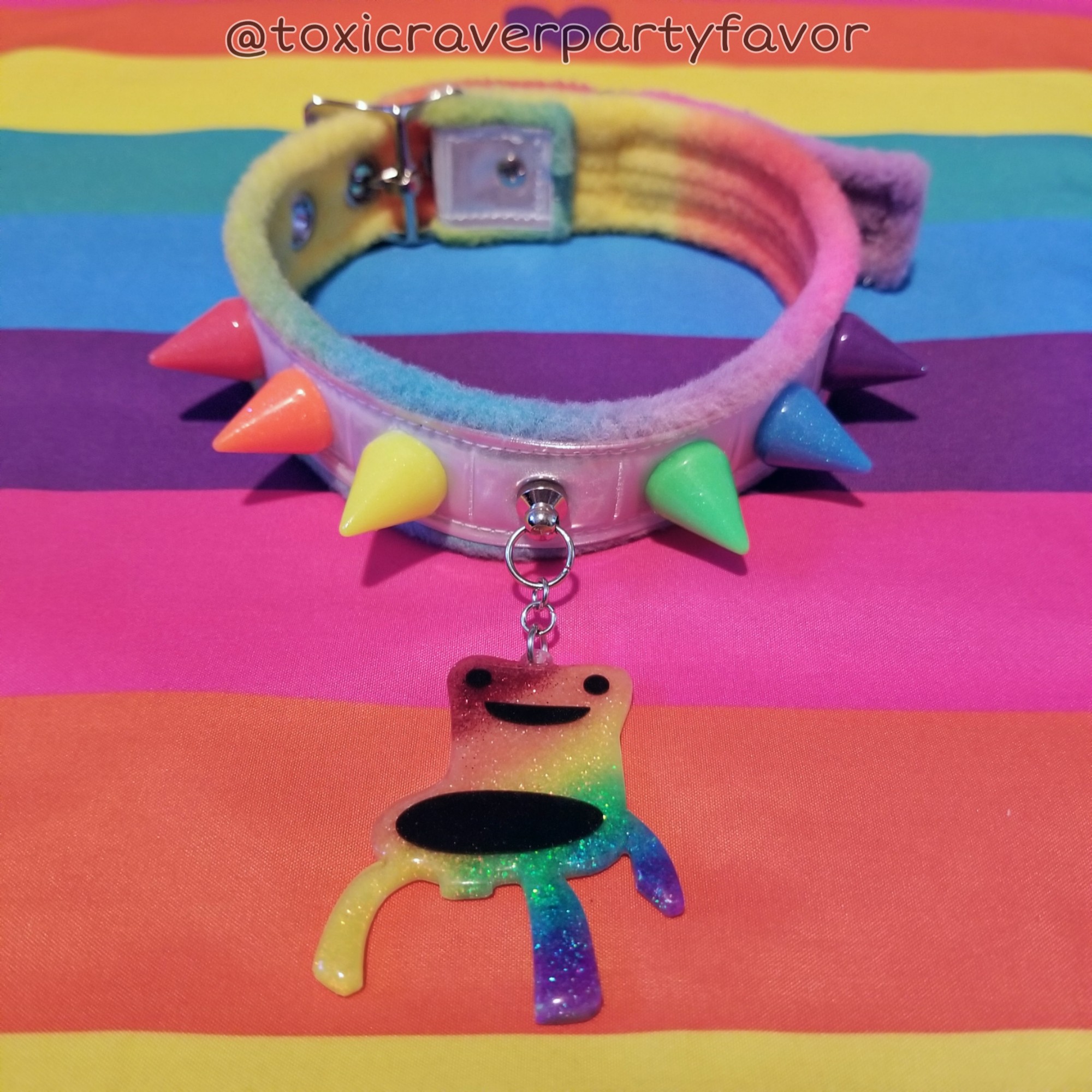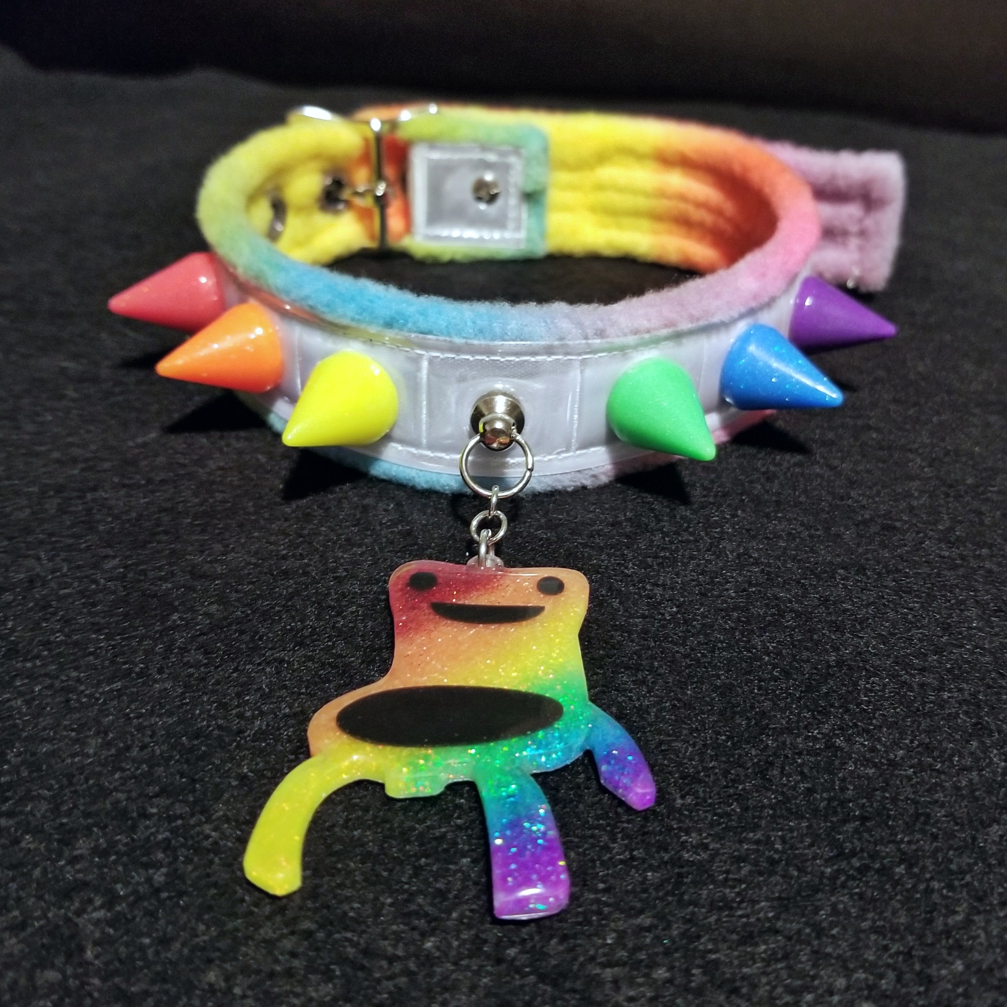 This collar is 1.25" wide and features a rainbow fleece base with white reflective vinyl, neon resin spikes, and a rainbow froggy chair pendant. It is adjustable in length to 13", 14", and 15".