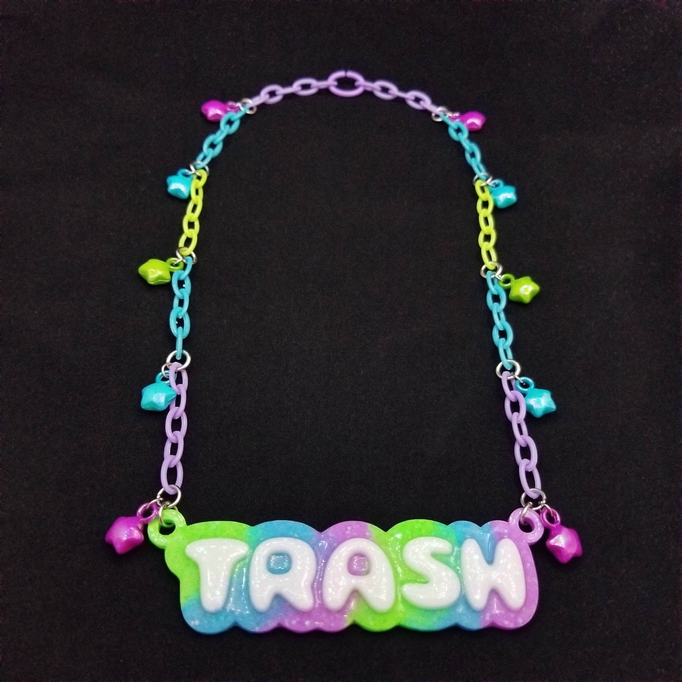 This necklace is 4.5" wide and 1.25" tall and features white letters on a neon green/blue/purple background on a 20" long matching plastic chain.