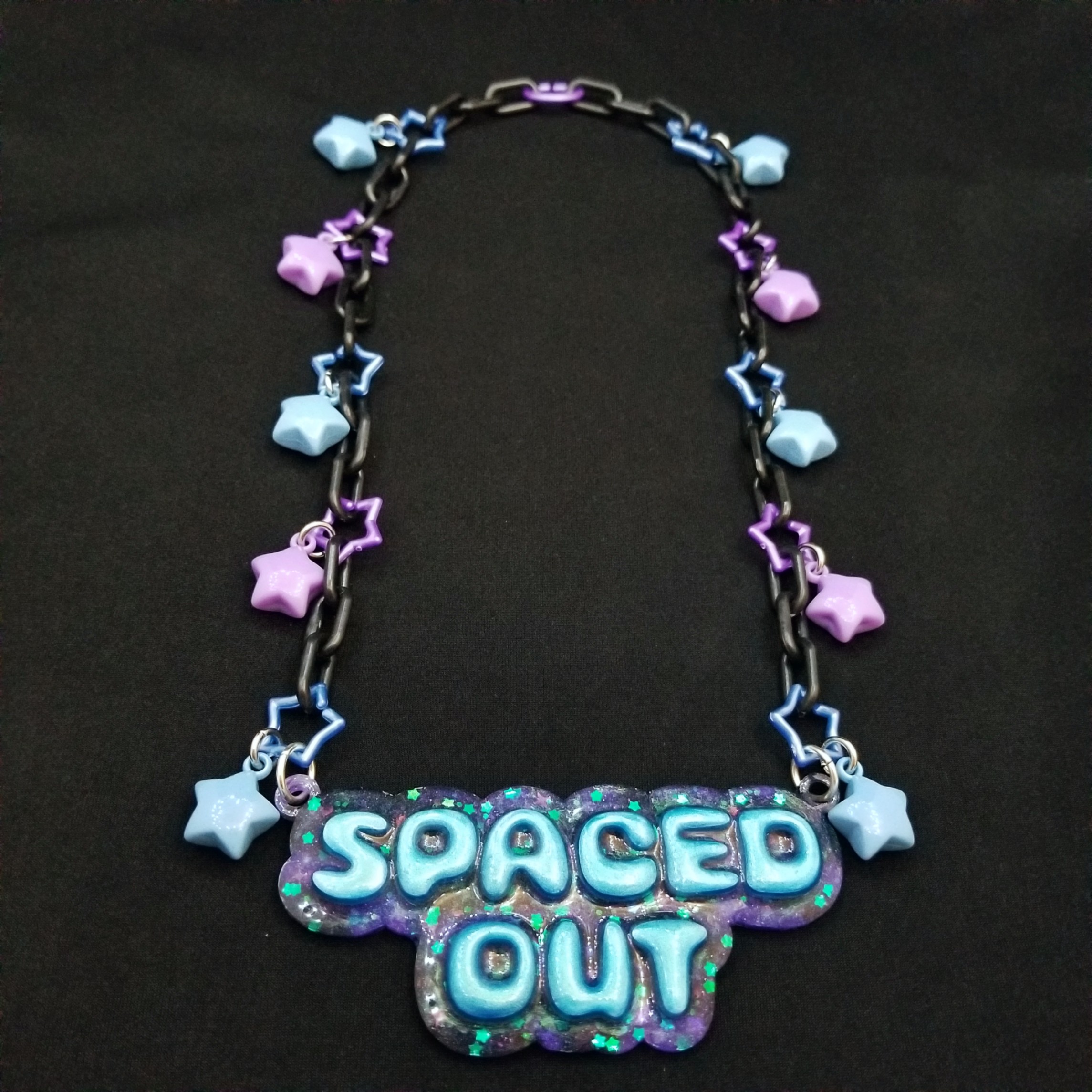 This necklace is 4.5" wide and 2" tall and features iridescent blue letters on a starry purple/black background on a 20" long matching plastic chain.