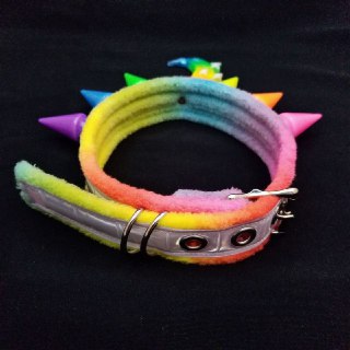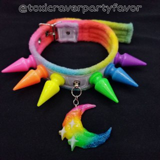 This collar is 1.25" wide and features a rainbow fleece base with white reflective vinyl, large neon resin spikes, and a rainbow faceted moon pendant that is about 2" x 2". It is adjustable in length to 13", 14", 15", and 16"