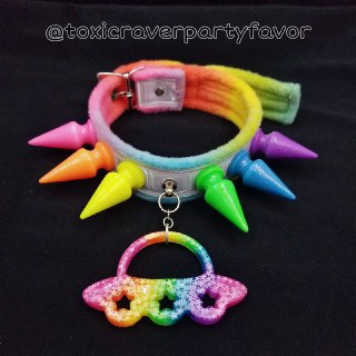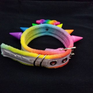This collar is 1.25" wide and features a rainbow fleece base with white reflective vinyl, large neon resin spikes, and a rainbow starry UFO pendant. It is adjustable in length to 13", 14", and 15"