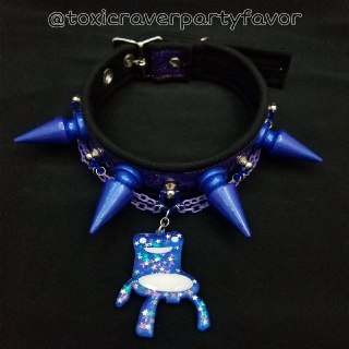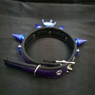 This collar is 1.25" wide and features a black fabric base with glittery blue reflective vinyl, large blue holographic resin spikes, and a starry blue holographic froggy chair pendant. It is adjustable in length to 13", 14", and 15".